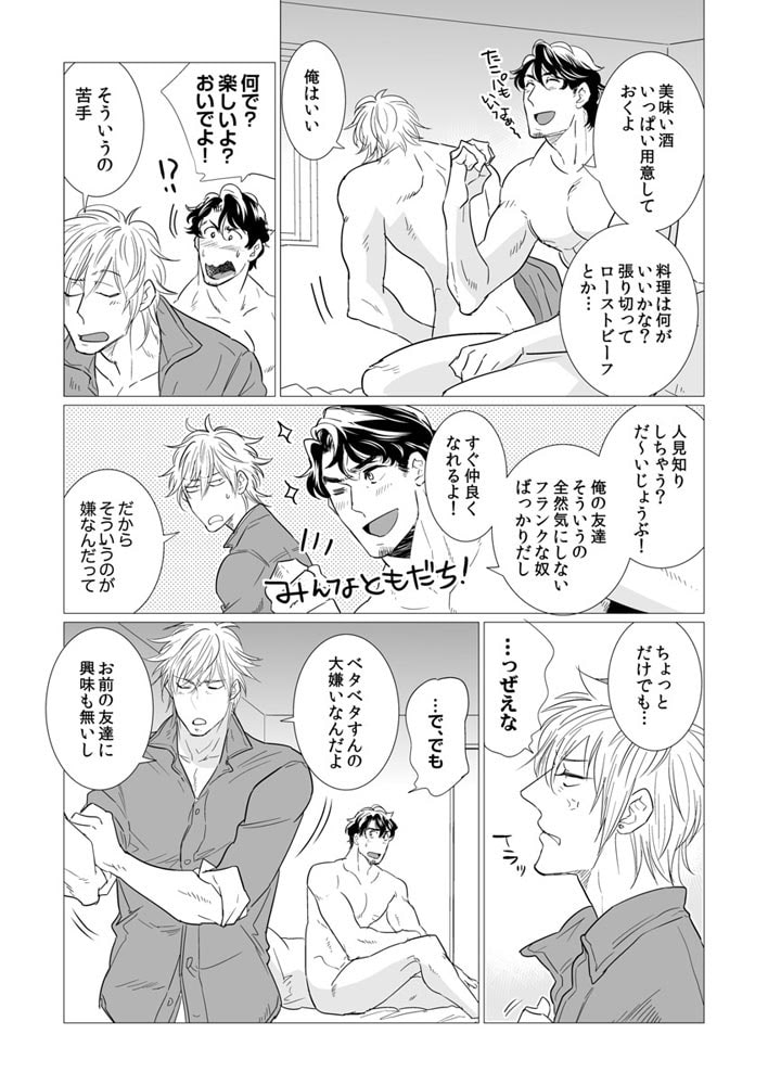 売れっ子タチ専門のゲイAV男優の大輝と蒼吾は犬猿の仲!そんな二人の元に飛び込んだ新しい仕事は、なんと大輝と蒼吾の絡みのAV撮影だった!タチ専門、しかも大っ嫌いな相手に掘られるかもしれない仕事なんてやってられるか!と一度は断るも、敏腕監督に言いくるめられこの仕事をうける事に…。しかし、撮影までに少しでも仲良くなれ。と手錠を掛けられ、ウィークリーマンションで一緒に生活することに!トイレに行くにも、シャワーを浴びるのも一緒で…その上、別の撮影にまで同行する羽目になり…!?