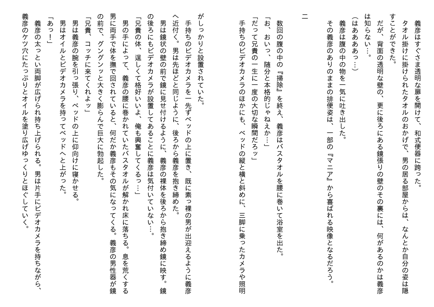マッチョな後輩•功介。ワイルドな先輩•義彦。男は彼らを徐々に淫乱な性奴に堕としていく…。アナル開発、初釜貫通、拉致、拘束、羞恥…そして前編を超えた過激な絶頂クライマックスまで、ノンストップで駆け抜ける大長編小説、遂に完結!