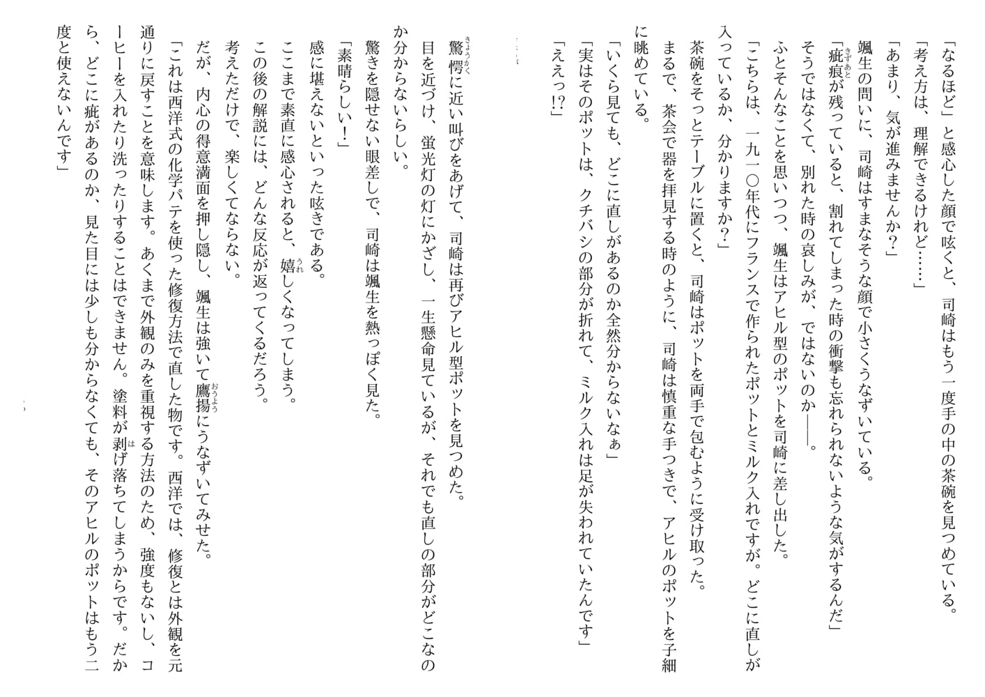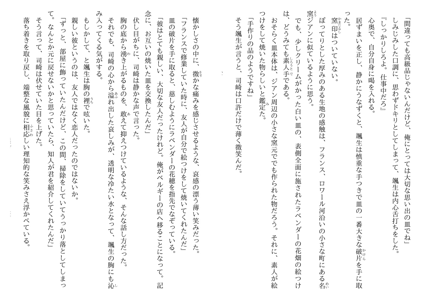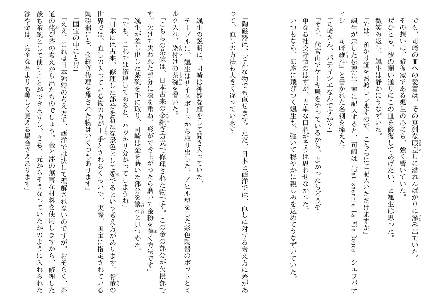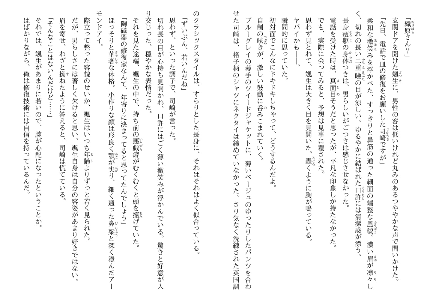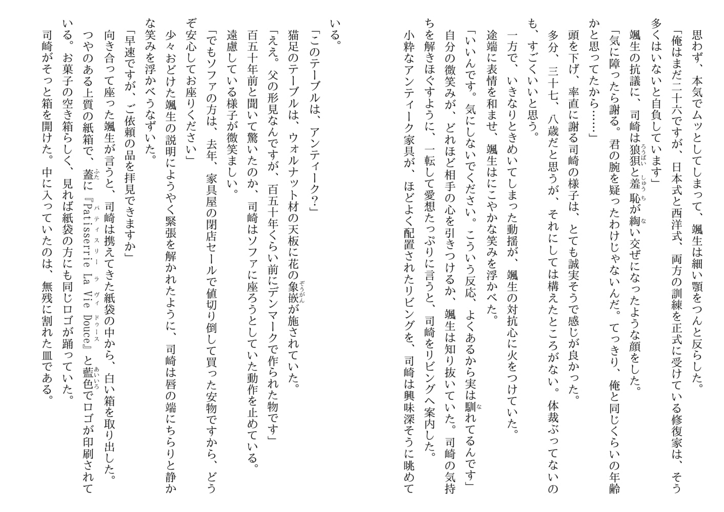 陶磁器の修復家として確かな腕を誇る弱冠26歳の青年、織原颯生。いにしえの美術品を修復し甦らせるという渋い仕事のわりに、天衣無縫で思い込んだら一途な面も…。ある日、颯生のもとに代官山のお洒落なカフェのオーナーパティシエ・司崎がやってきた。長身痩躯で端整な顔立ちの司崎に思わずときめく颯生の胸。そんな司崎が修復を依頼してきたのは一枚の思い出の皿だった。フランスでの修業時代に大切な友人と互いに焼いた皿を交換したというその逸話に、未だ癒えていない司崎の心の傷を感じ取った颯生は足繁く彼の店を訪れるようになった。皿だけでなく砕けてしまった司崎の心もこの手で直すことができたら…。スイーツ好きの愛犬オーディンも巻き込んで、恋心の赴くまま颯生のひたむきなアプローチが続くが…。パティシエと修復家。年の差ありの職人同士…甘くて苦い恋♪