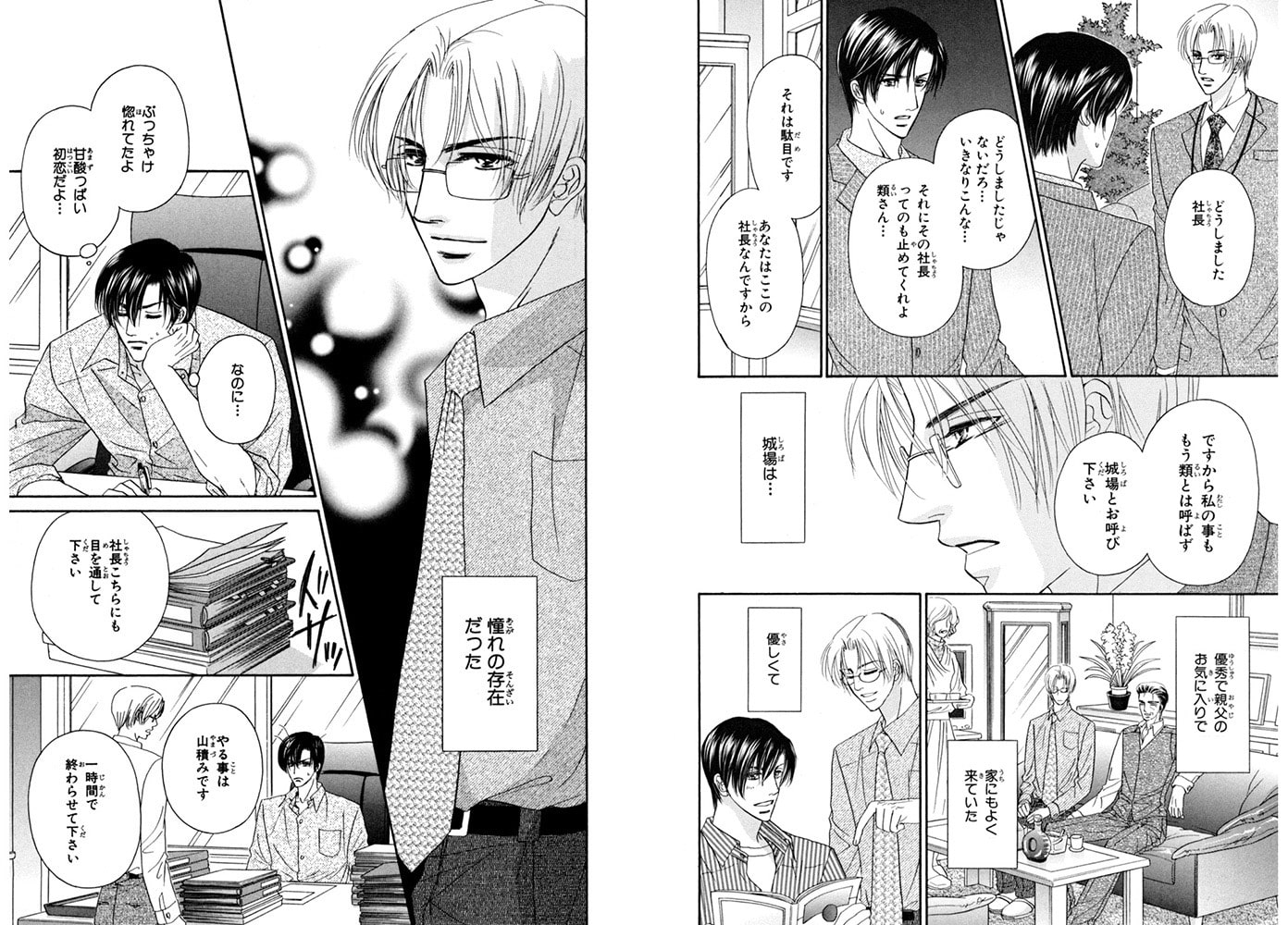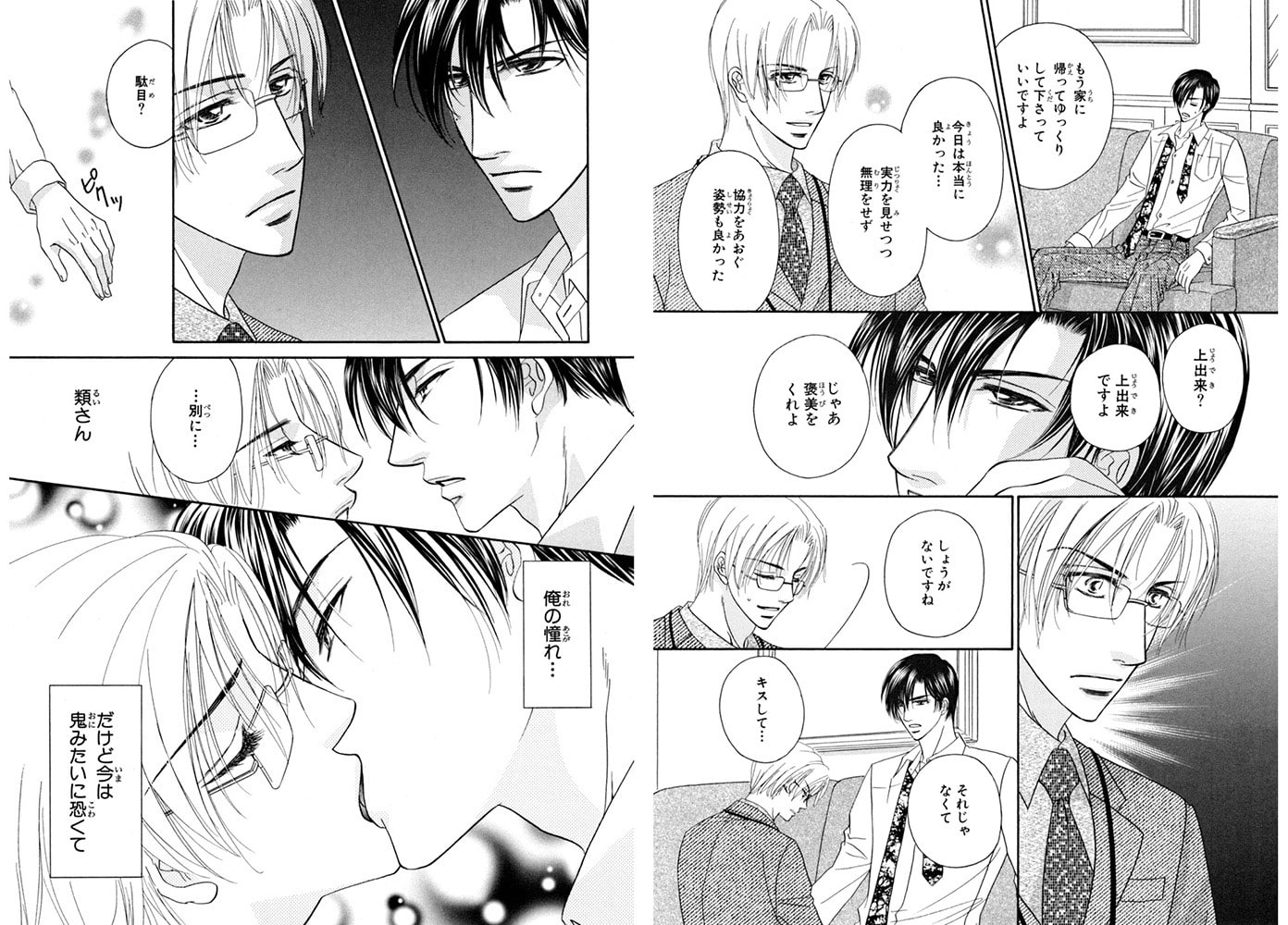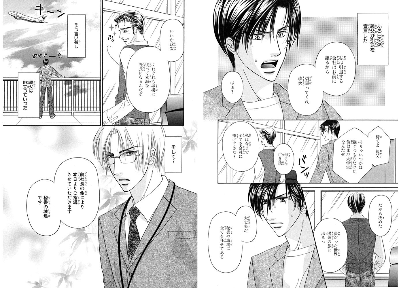 小さな会社を経営する勇司のもとに採用してほしいとやってきた男。元エリート秘書という肩書きの彼はなんと、中学時代の恋人純也だった。ヤンキーだった純也は勇司を慕い、何かとかわいく甘えてきていた。しかし勇司は自分にめりこむ純也の将来を心配して、身を引いていったのだった。それを誤解した純也は、復讐を胸に誓って再び勇司のところにやってきたのだと言う。昔のヤンキー姿とは似ても似つかぬエリート秘書になっていた純也は、仕事もよくできて別人のように見える。二人が再びからだを重ねるのに時間はかからなかった。暴漢に襲われた純也を助けた勇司は、抑えきれない気持ちのまま、純也にキスをする。「あんたが好きなんだ……」純也の告白を聞きながら激しいキスをかわす。純也は勇司にアソコをなぶられながら、快楽に頬を染める姿は昔と変わらない。キツくてもいい……勇司の上で激しく乱れる純也を、強く抱きしめるのだった。