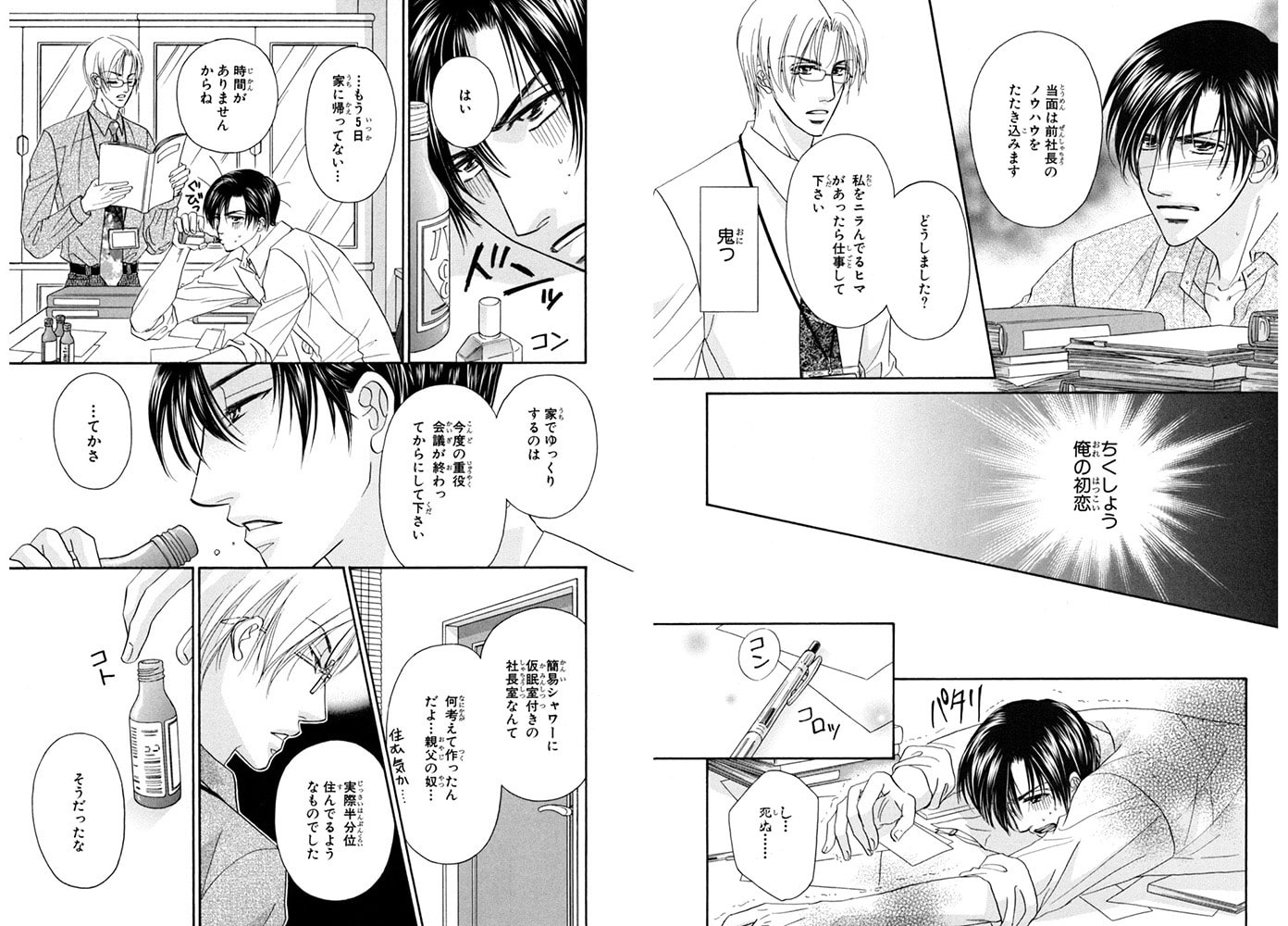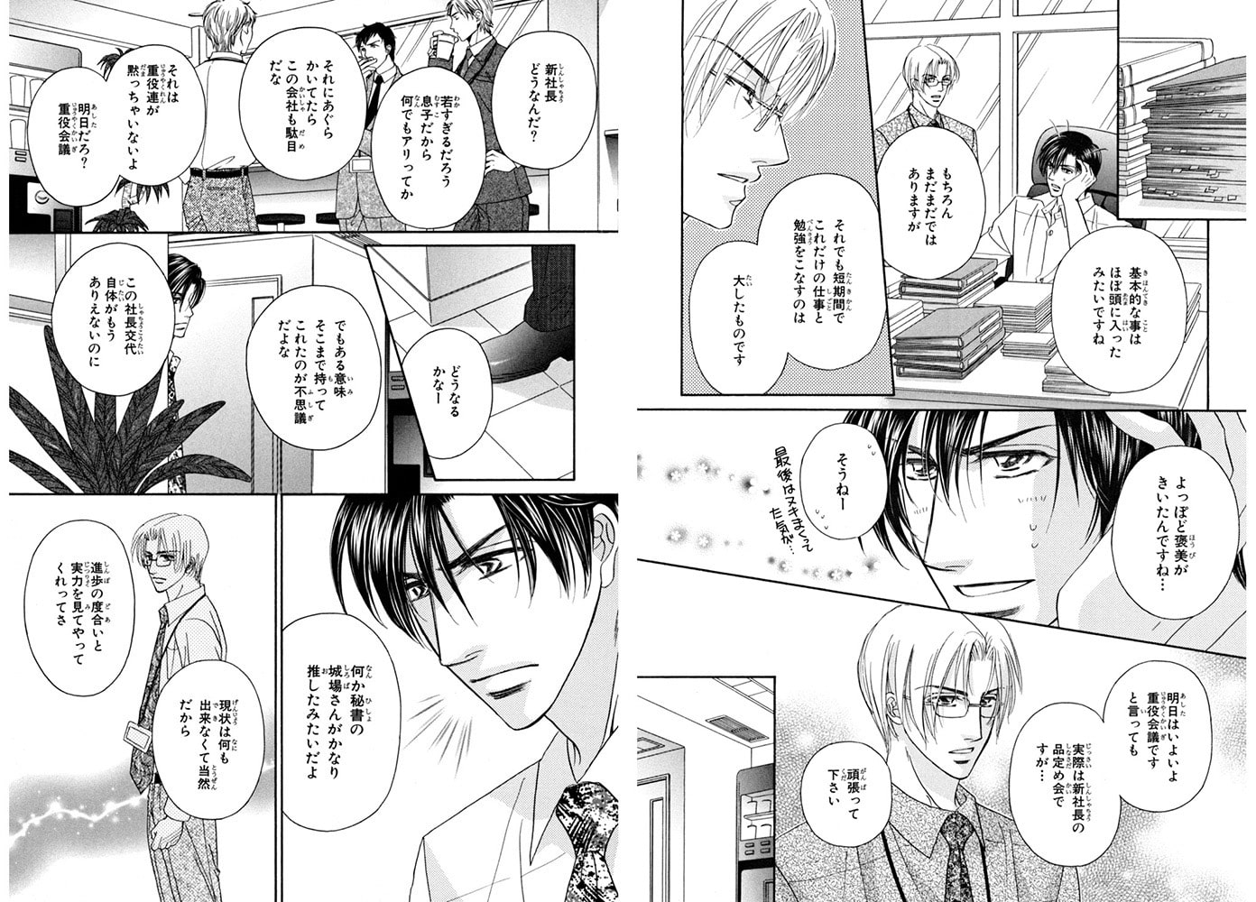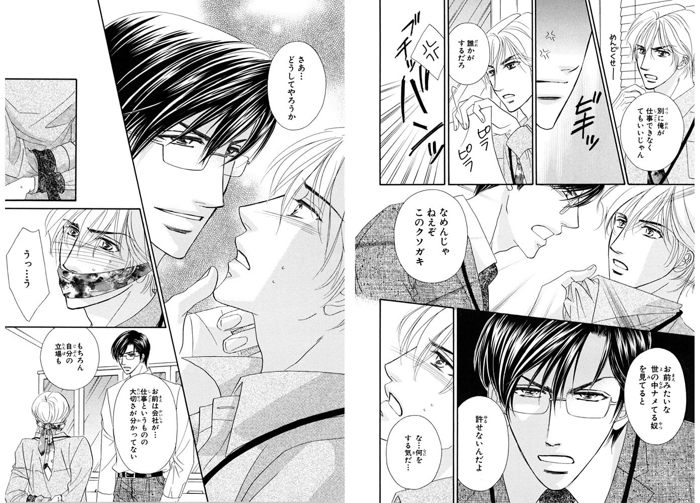 小さな会社を経営する勇司のもとに採用してほしいとやってきた男。元エリート秘書という肩書きの彼はなんと、中学時代の恋人純也だった。ヤンキーだった純也は勇司を慕い、何かとかわいく甘えてきていた。しかし勇司は自分にめりこむ純也の将来を心配して、身を引いていったのだった。それを誤解した純也は、復讐を胸に誓って再び勇司のところにやってきたのだと言う。昔のヤンキー姿とは似ても似つかぬエリート秘書になっていた純也は、仕事もよくできて別人のように見える。二人が再びからだを重ねるのに時間はかからなかった。暴漢に襲われた純也を助けた勇司は、抑えきれない気持ちのまま、純也にキスをする。「あんたが好きなんだ……」純也の告白を聞きながら激しいキスをかわす。純也は勇司にアソコをなぶられながら、快楽に頬を染める姿は昔と変わらない。キツくてもいい……勇司の上で激しく乱れる純也を、強く抱きしめるのだった。