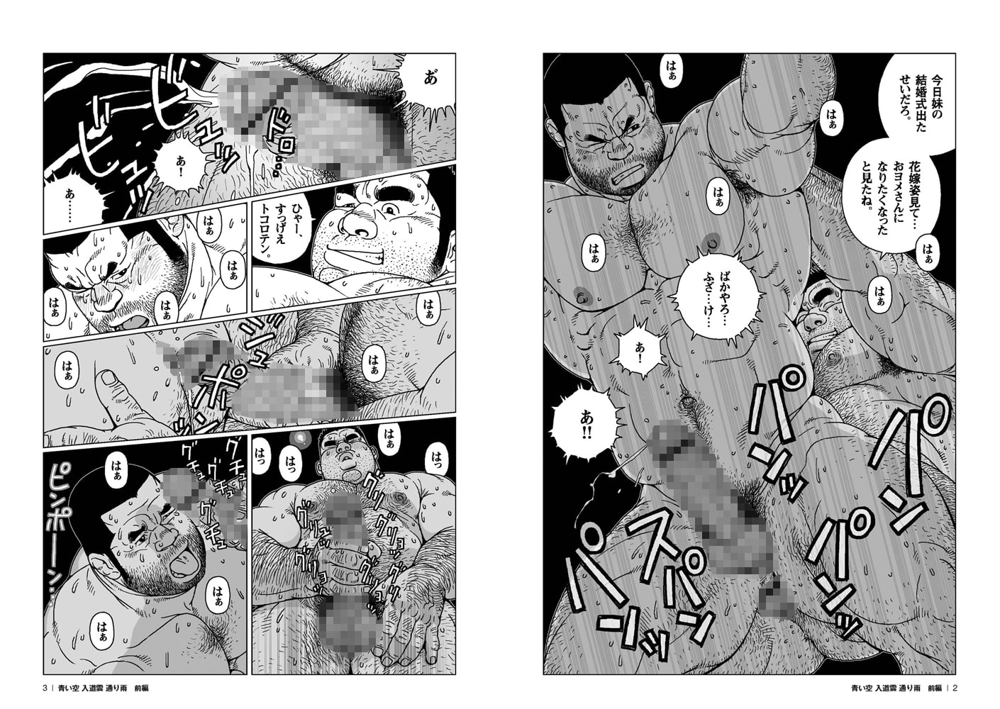 同居中のガチムチカップル•大吉と幸作の家に、いきなり大吉の父親•平八郎が訪ねてくる。セックス中だった二人は行為を中断し、慌てて服を着替え、幸作は居候中の友人という設定で、なんとかゴマかそうとするのだが…。