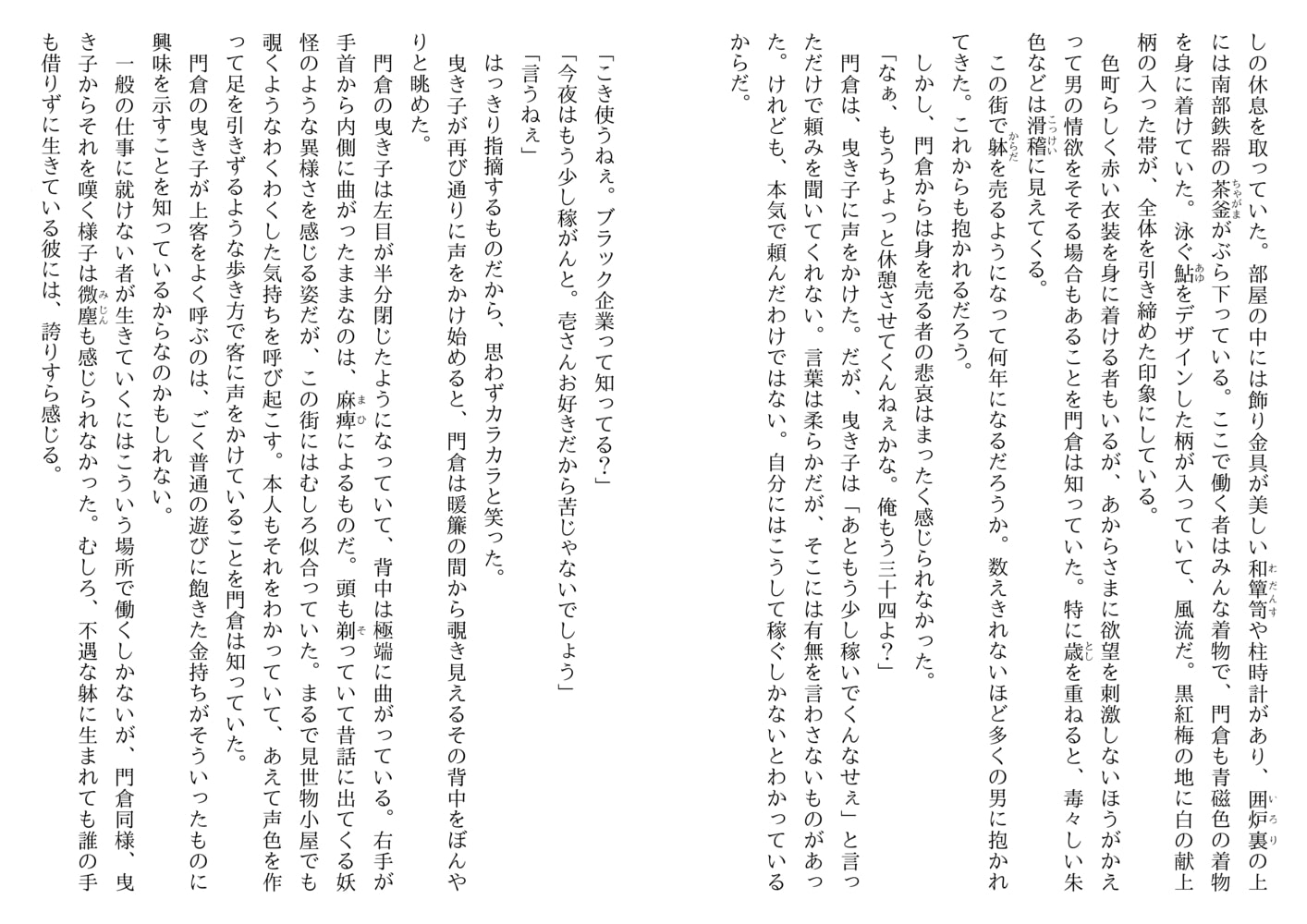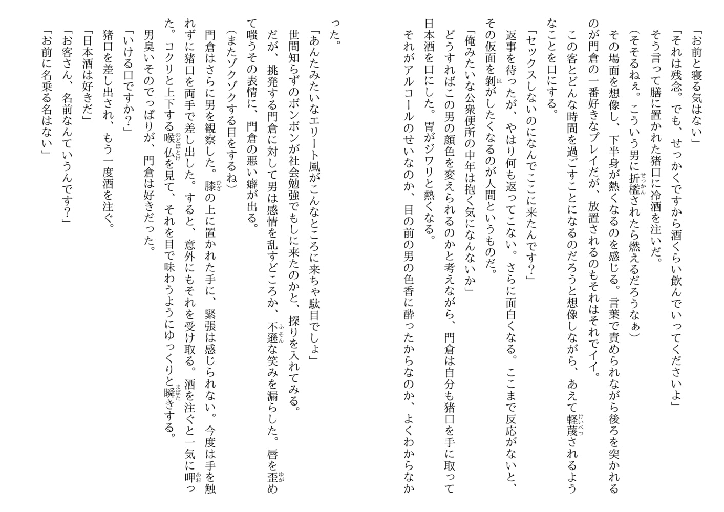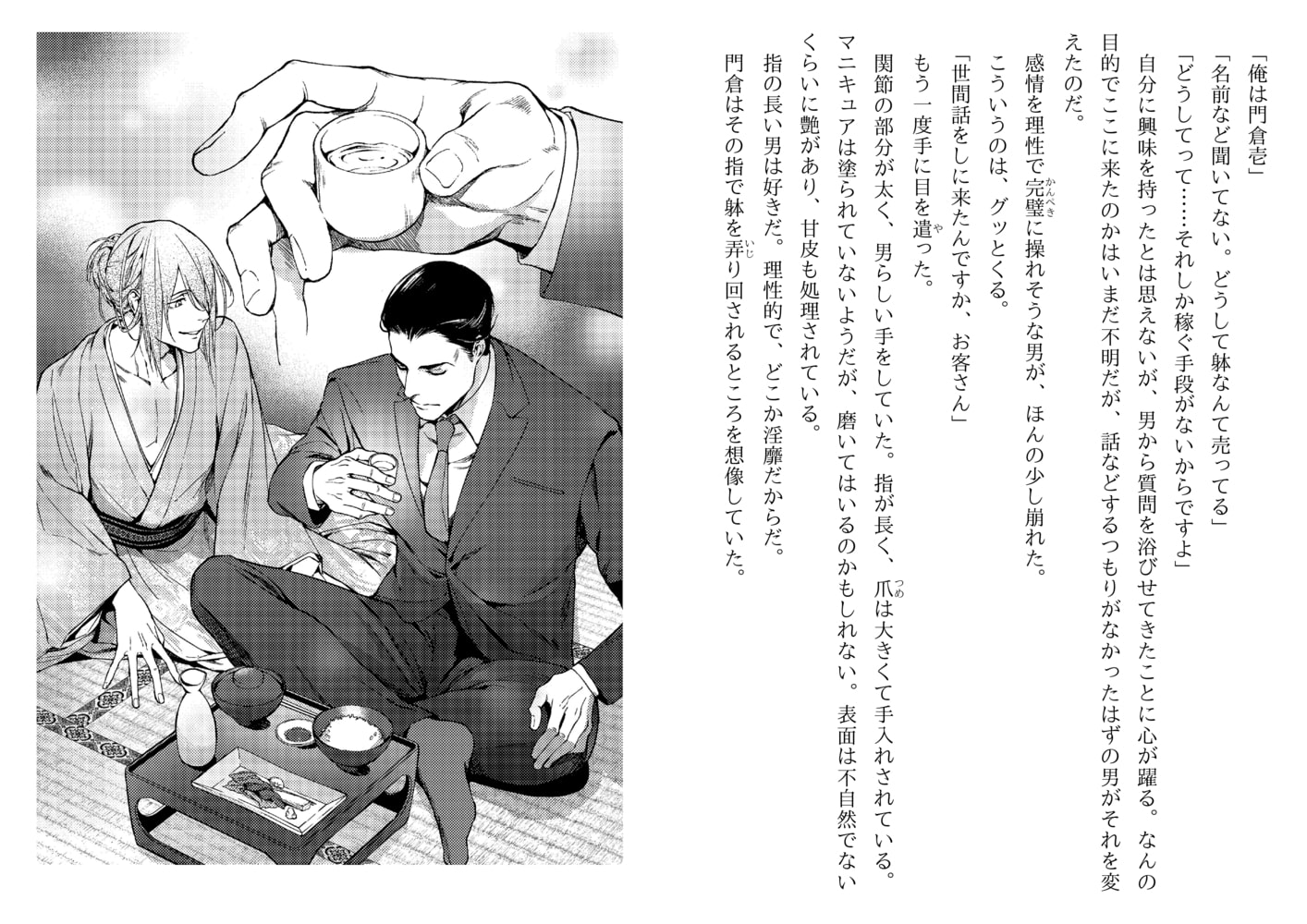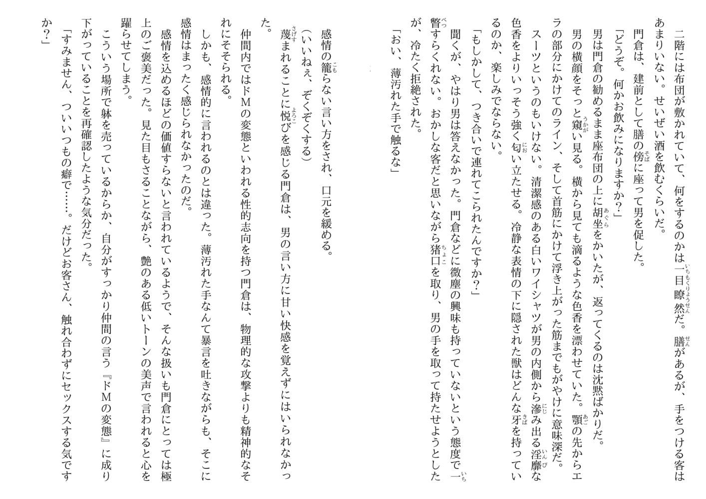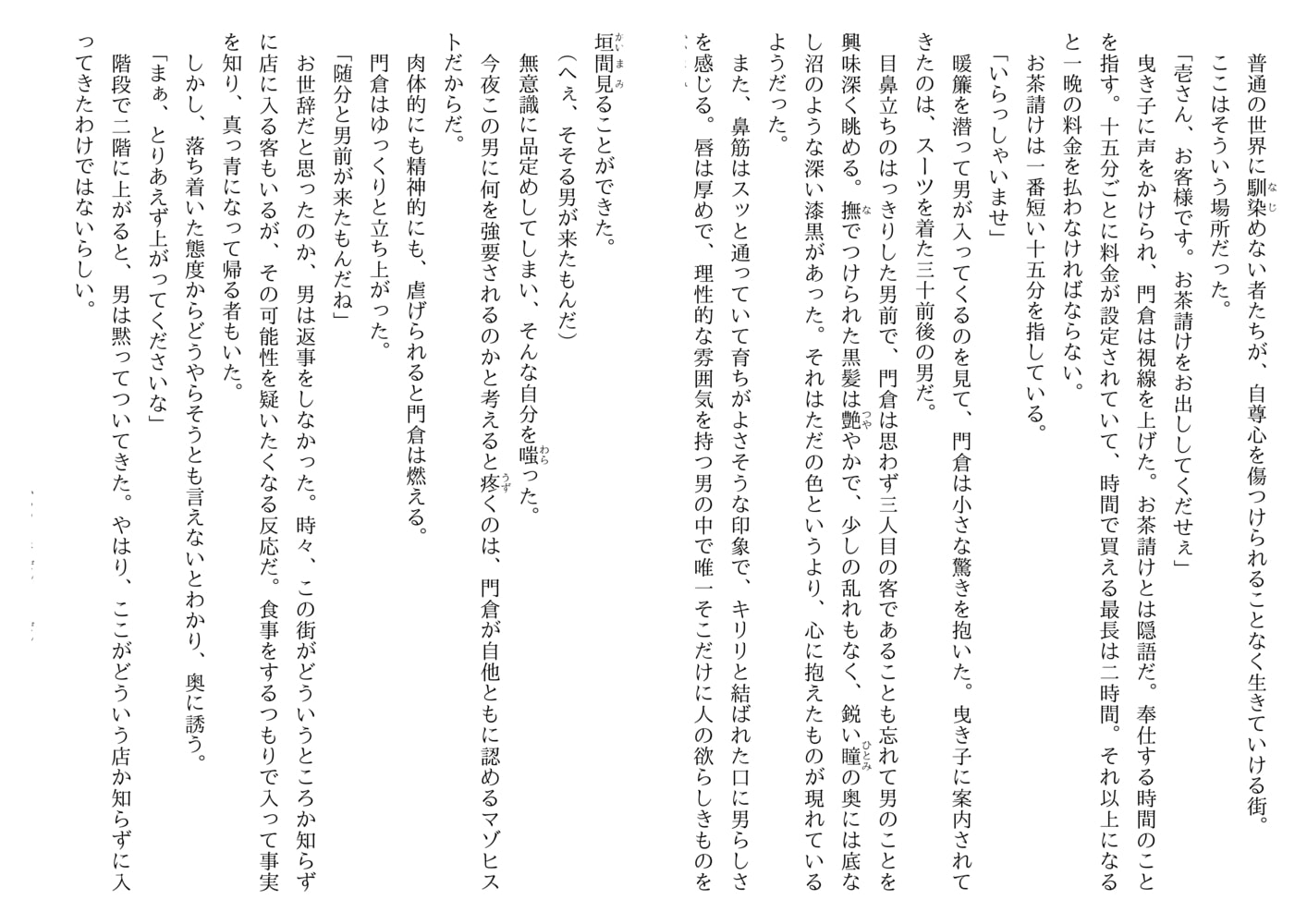 昭和風な怪しいエロスが漂う街、通称『旅人遊廓』――そこで男娼として暮らす門倉壱は虐げられることに悦びを感じるドMの変態。そんな彼の店へある日、エリート然とした長身の男前、手塚がやってくる。侮蔑の眼差しで門倉を嬲りながらも指一本触れずに帰っていく謎の男。門倉の股間が疼く。客に惚れるのはご法度の遊廓だが、ひと月が過ぎ初めて手塚に犯された門倉の想いは募る一方で…。手塚はいったい何者なのか…?