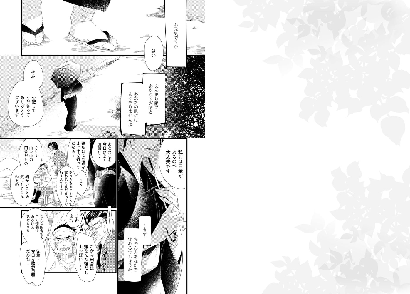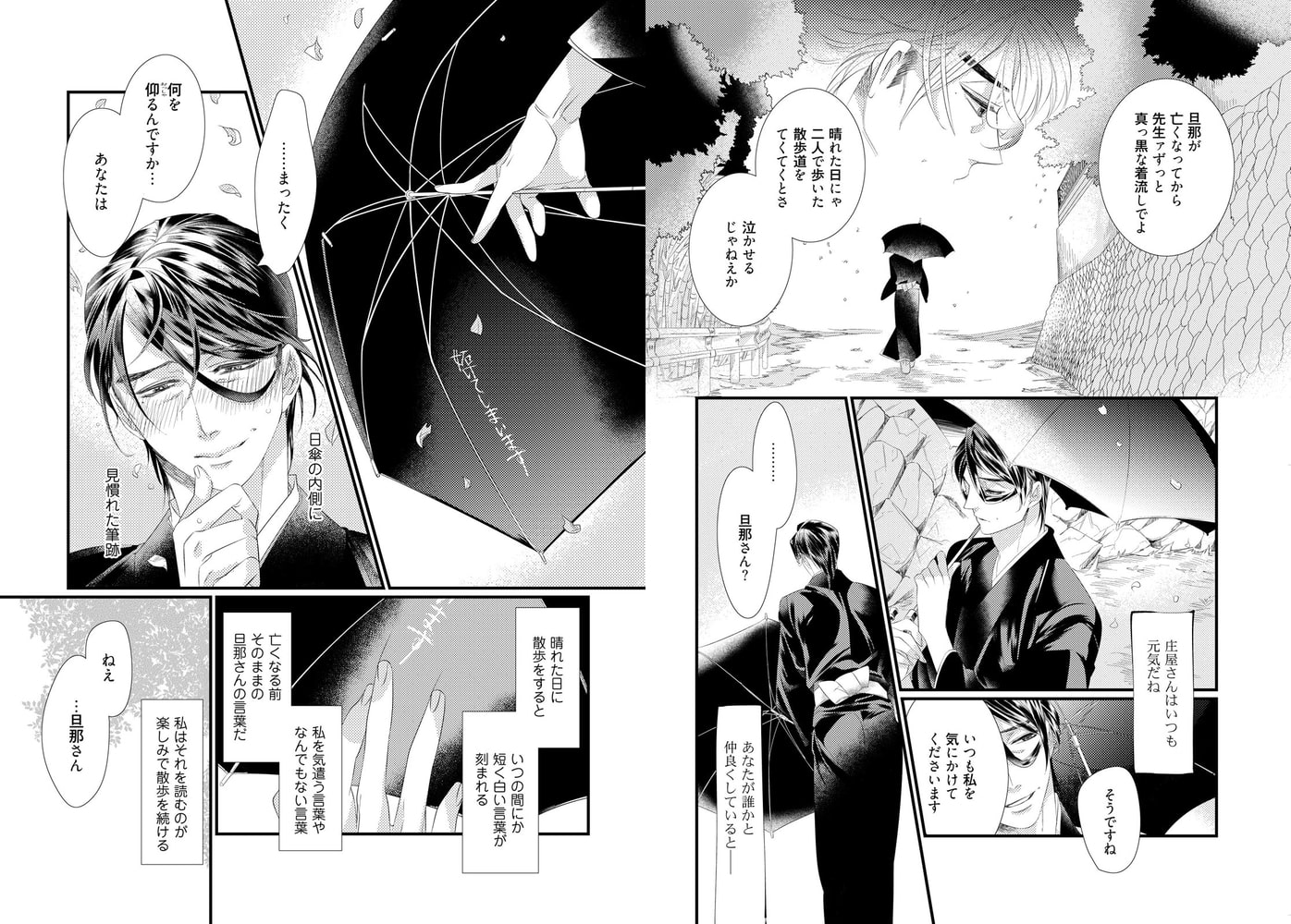 「彼に抱かれてきなさい」亡き旦那さんの形見である日傘。そこに浮かびでる旦那さんの筆跡は、先生と旦那さんの秘密の会話。そしてその会話を知る唯一の存在が若大将――『彼』だった。旦那さんの言葉に従うことが想いの証明だと信じ、一回り以上年下の若大将に抱かれる先生。若き猛りに乱れ背徳を感じながらも、その一途な想いは……。