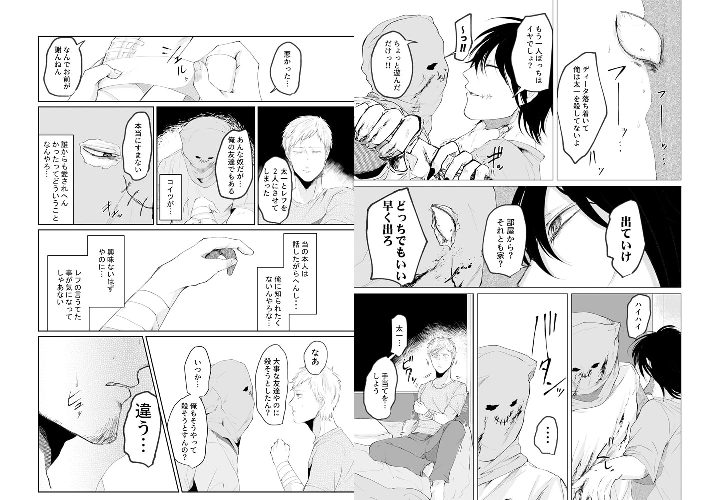 覆面殺人鬼に監禁されて処女を奪われました。─気が付くと知らない部屋で手足を縛られ監禁されていた太一。一人キャンプで殺人現場を見てしまい、殺人鬼に拘束されたらしい。俺の人生ここで終わりか…と思ったら耳を舐められた!なんやねん!かと思えば正面に椅子を置いて静かに見つめ始めた!ホンマになんやねん!!拘束を解かれたと思えば「惚れた」!?俺も殺しの対象ちゃうんかーーーい!!!!何とか逃げ出そうと自分も惚れたと嘘を吐いたら、いきなりデカすぎるアレを突っ込まれて!?慣らされていないせいで痛いはずなのに、どんどん気持ちよくなってきて…「声…抑えるな」アカン…はよ…イって…っ!覆面殺人鬼と関西人の歪な同居生活が今始まる!!