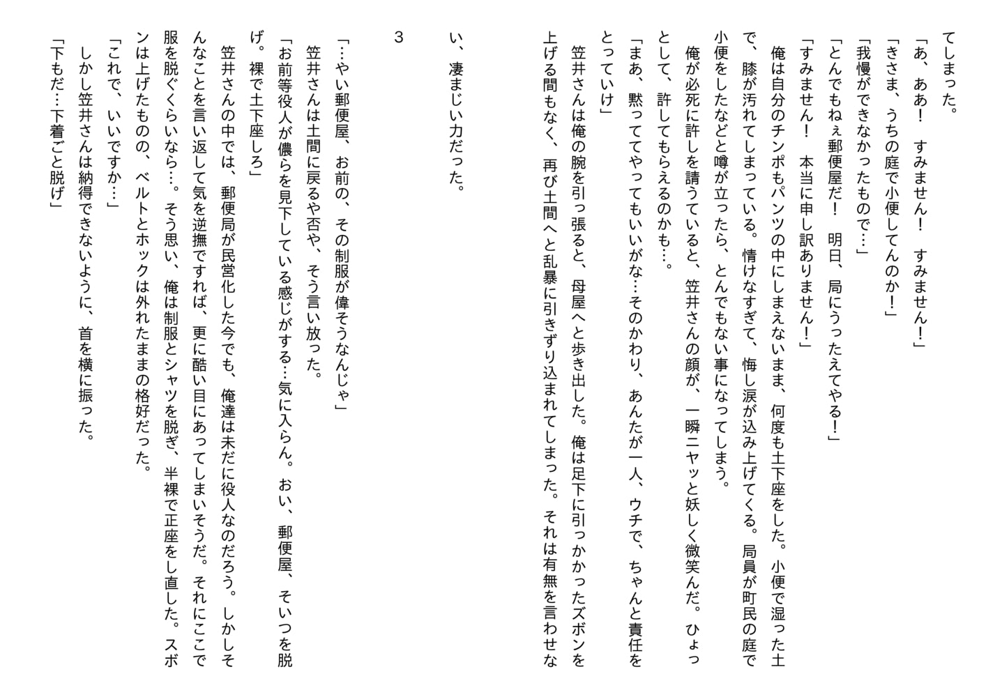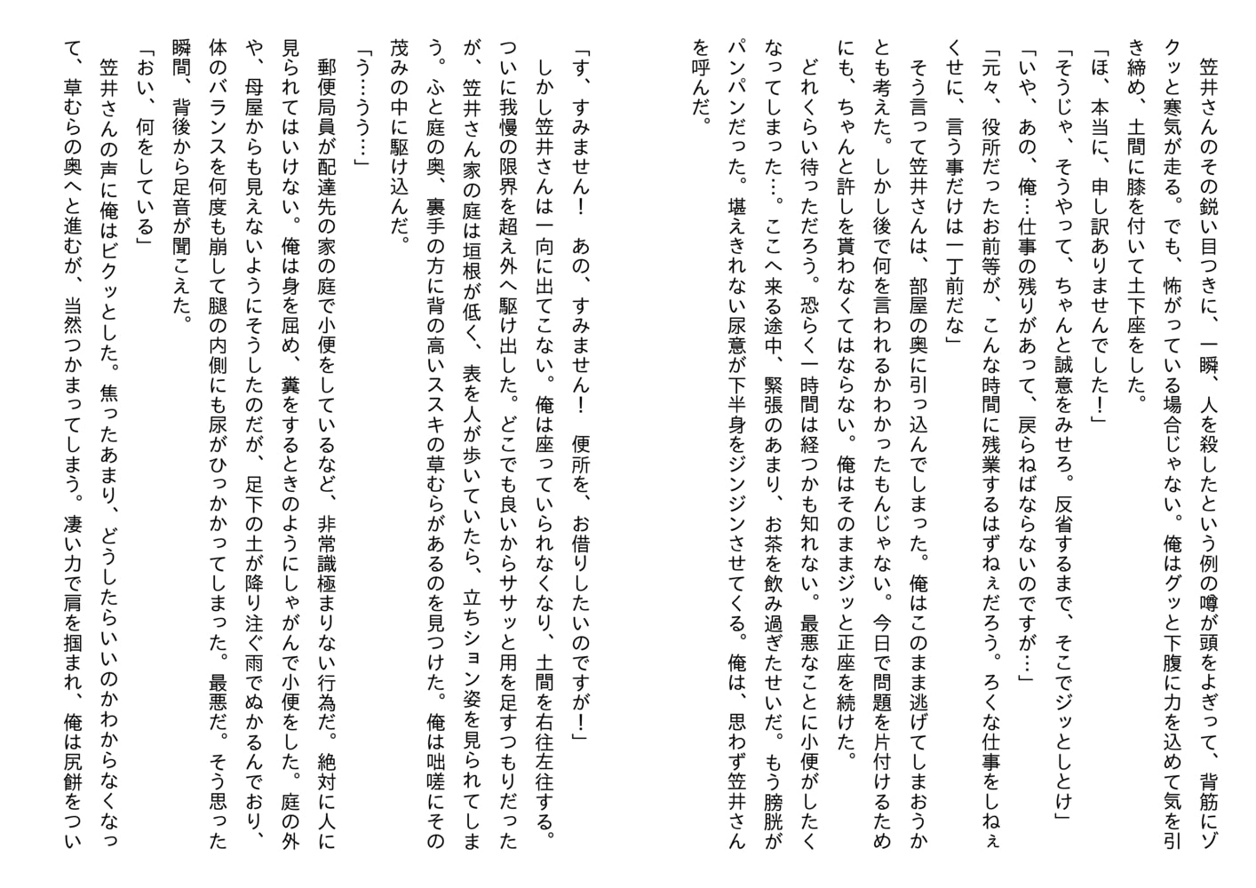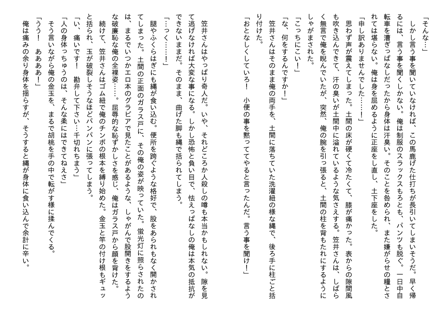 「手に持たれているソレを見て俺はゾッとした。綿棒だった。何をされるのか想像するのは簡単だった。『ああ! やだ! 止めて!』俺は恐怖で身体を揺さぶる。『大声を出すな!』笠井さんは自分の首にかけていた手ぬぐいを、猿轡の様にして結び目を作ると、俺の口に噛ませた。声を塞がれ、俺は首を振って必死に許しを請う。しかし、無駄な抵抗とばかりに、再び笠井さんにチンポを握られる。『ん! ん! ん!』激痛が鈴口を抉った。尿道に綿棒を差し込まれてしまったのだ。」(本文より)