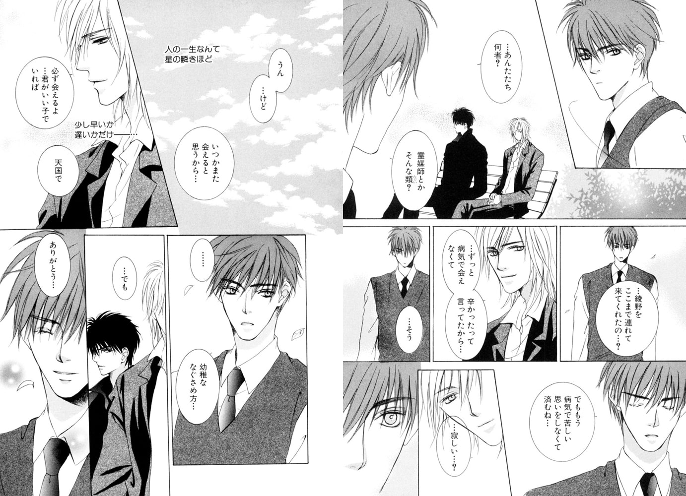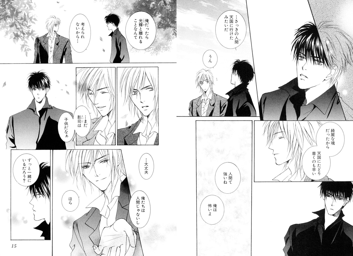 白天使の光輝と黒天使の影司の仕事は、亡くなった人間の魂を導くこと。無鉄砲な影司と、彼を見守る優しい光輝は、お互いに最高のパートナーだ。けれど、幼いと思っていた影司が大人びた顔を見せるようになり、男として急成長しはじめたことにとまどう光輝は-?!切なさと愛おしさが交錯するイノセントロマンス☆