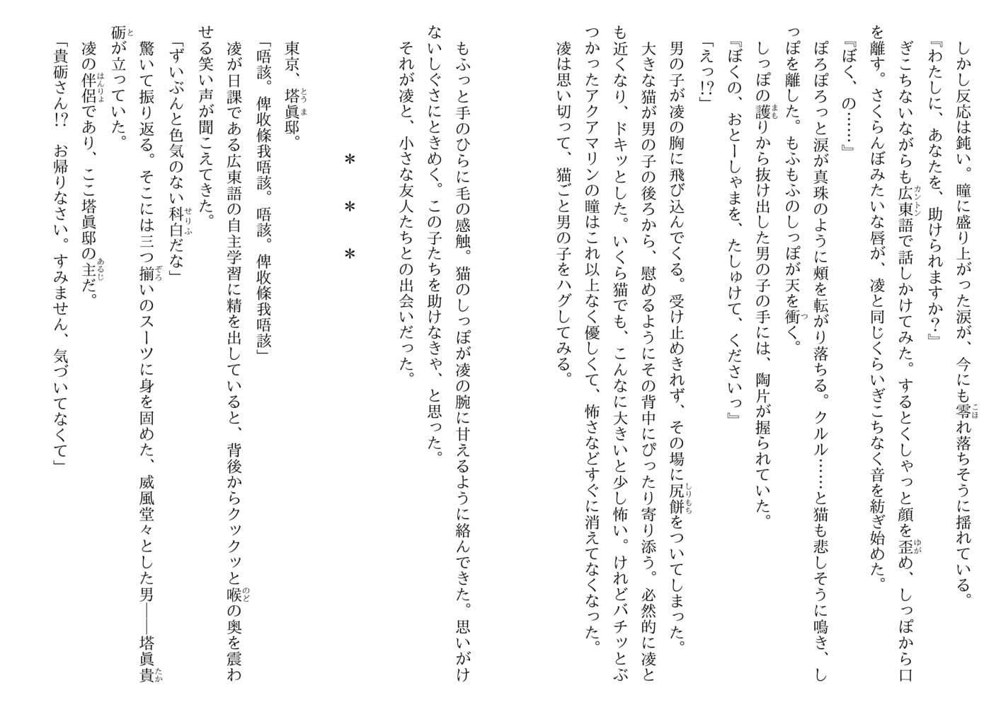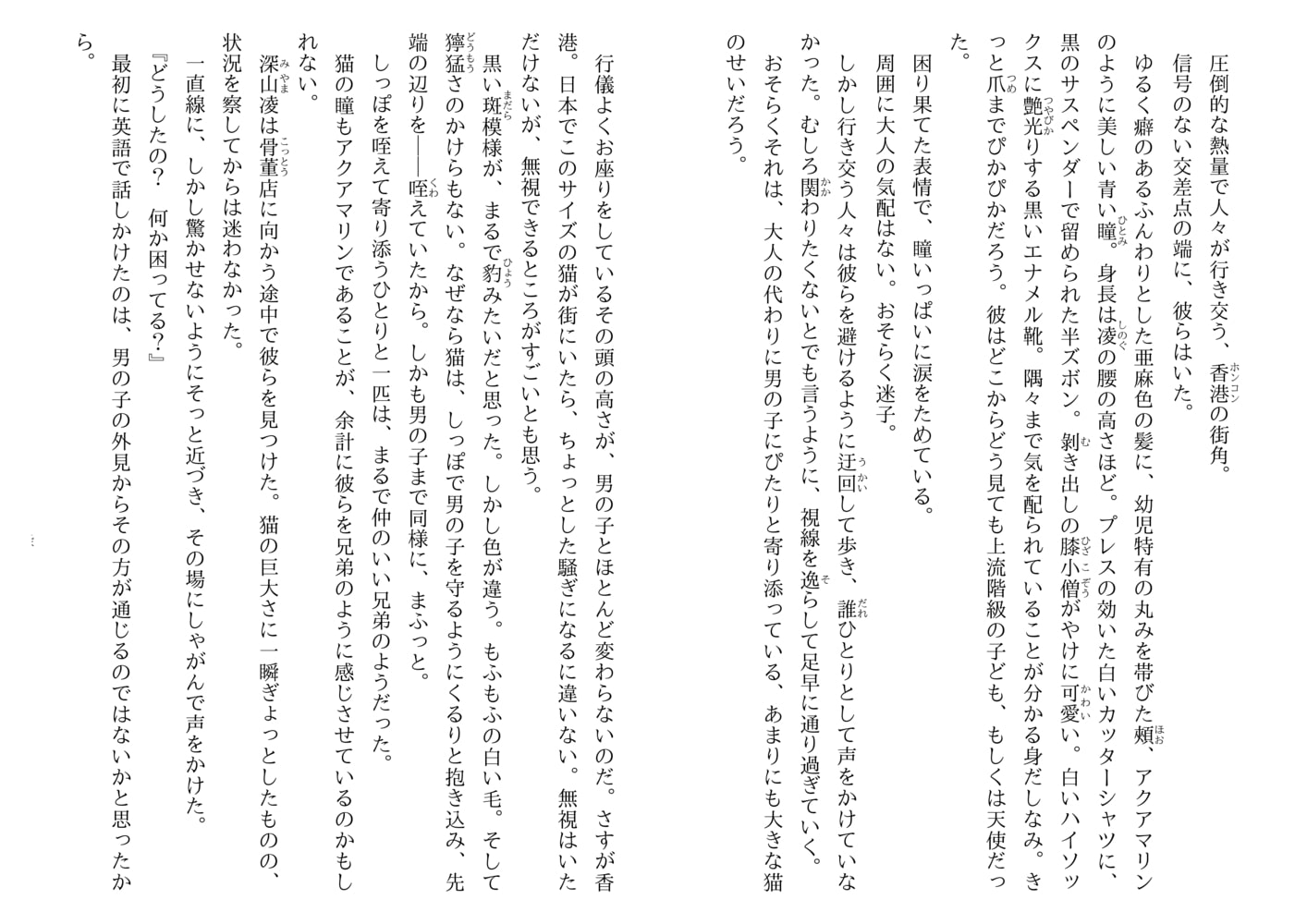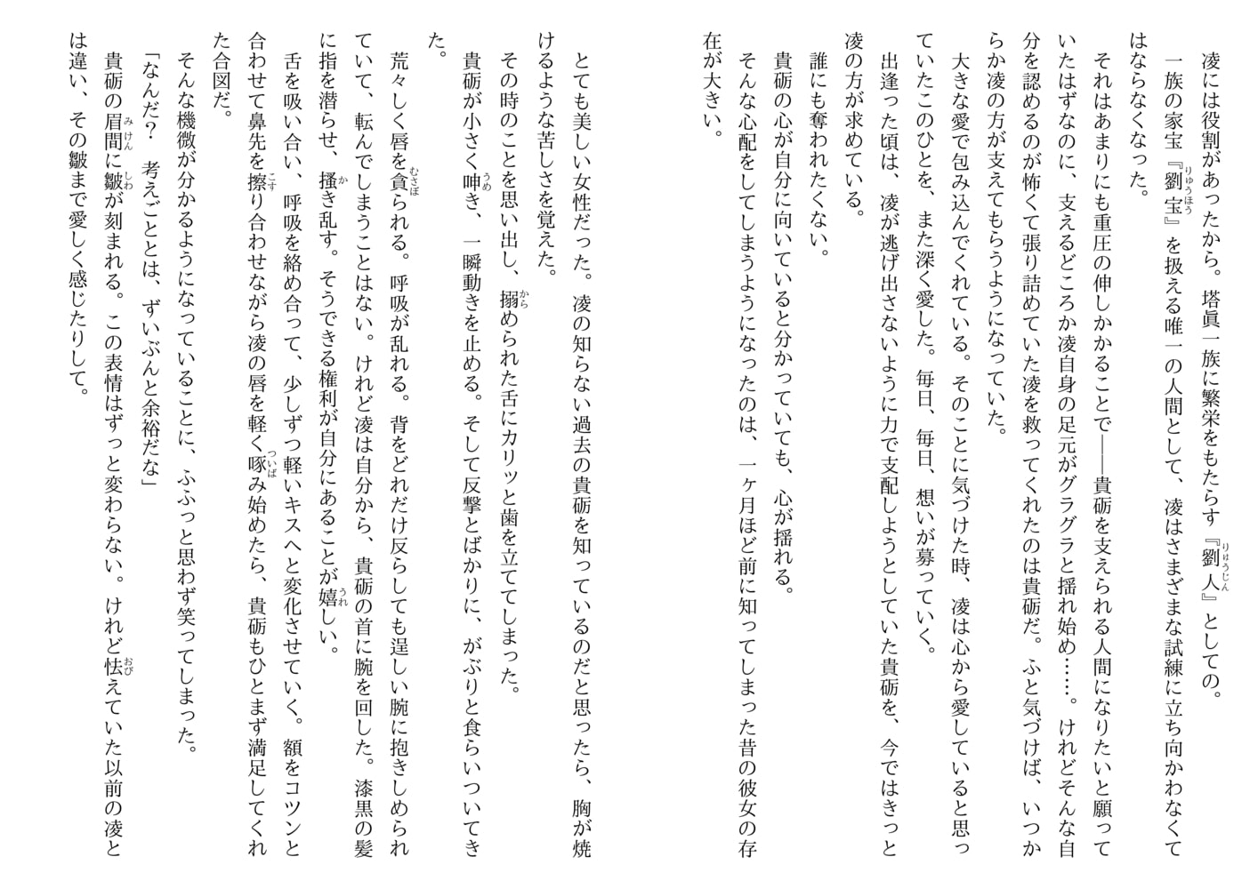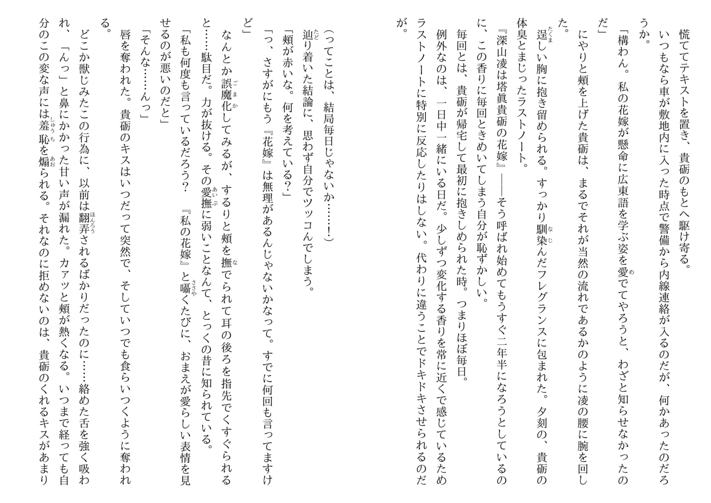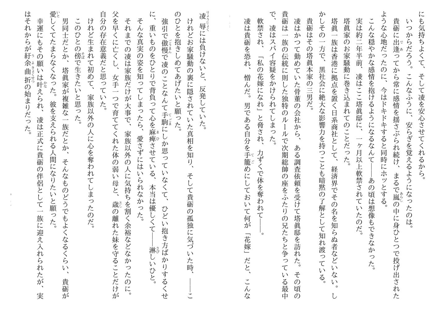 元骨董商の深山凌が、香港に拠点をおく資産家、塔眞家の三男・貴砺の伴侶となって二年半。傲慢ながらも大きな愛で自分を包んでくれる貴砺の支えになりたいと凌は日々研鑽を積んでいた。ある日、凌は香港の街角でロシア人の男の子ルーセニカと巨大な飼い猫…ではなく雪豹のシュエに遭遇。「おとーしゃまを、たしゅけてください」と懇願され、骨董店から連れ去られた少年の父の行方を捜すことに…。《花嫁色》シリーズ待望の新作!