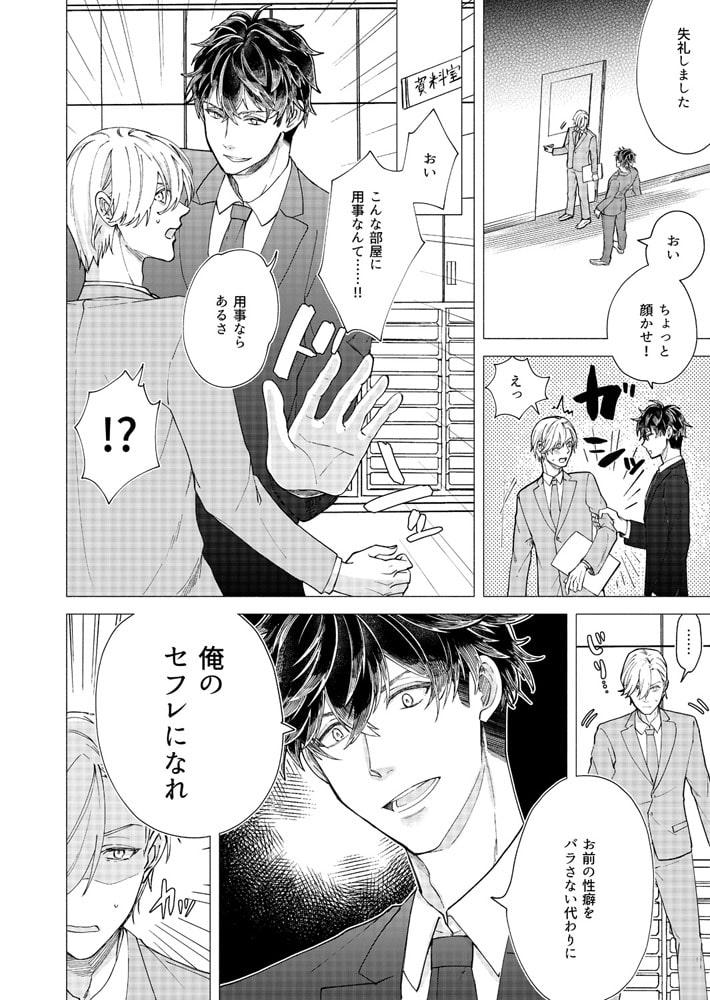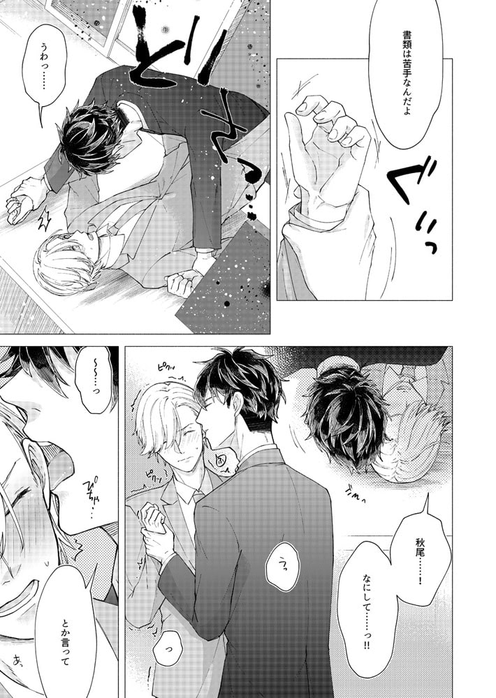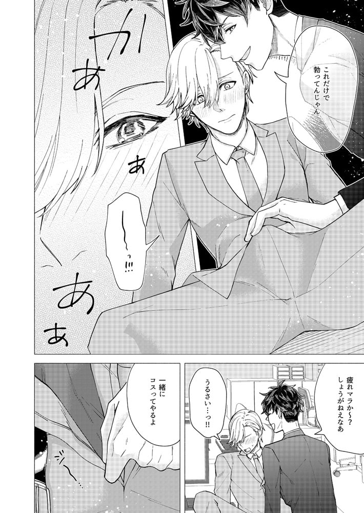 「バカ、そんなとこ触るな…アァッ!」営業成績トップのサラリーマン・秋尾は、神経質な同期の冬野が苦手だった。仕事のやり方も性格も真逆で犬猿の仲…なのに、ある日2人っきりで泊まり掛けの出張に行くことに!しかもホテルまで同室だって!?アイツと一晩過ごすのか…と憂鬱な気持ちでドアを開けると、奥から何やら音がする。覗いたらそこには、ア〇ニー真っ最中の冬野が!?バイブを尻に突っ込みアンアン喘ぐ堅物同期の姿に、思わず股間は反応してしまい…。興味本位でチ〇コを挿入れてみれば、なんだよ案外イケんじゃね?これは良いオモチャ見つけたな。バイブじゃ届かない奥まで攻めて泣かせてやるから、もっとエロい顔見せてみろよ!!