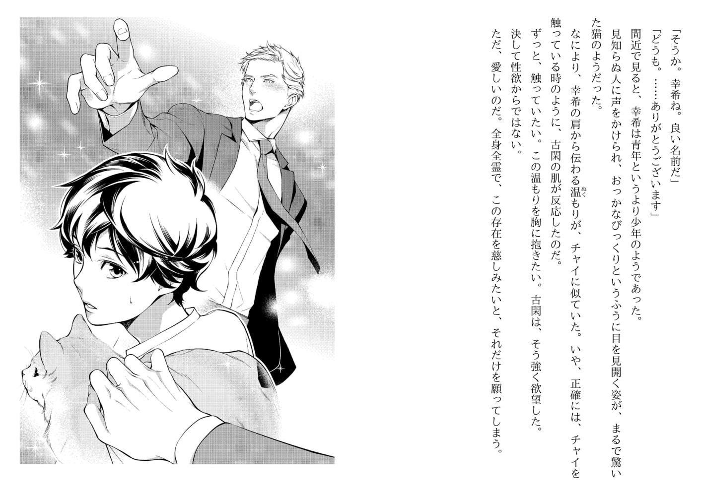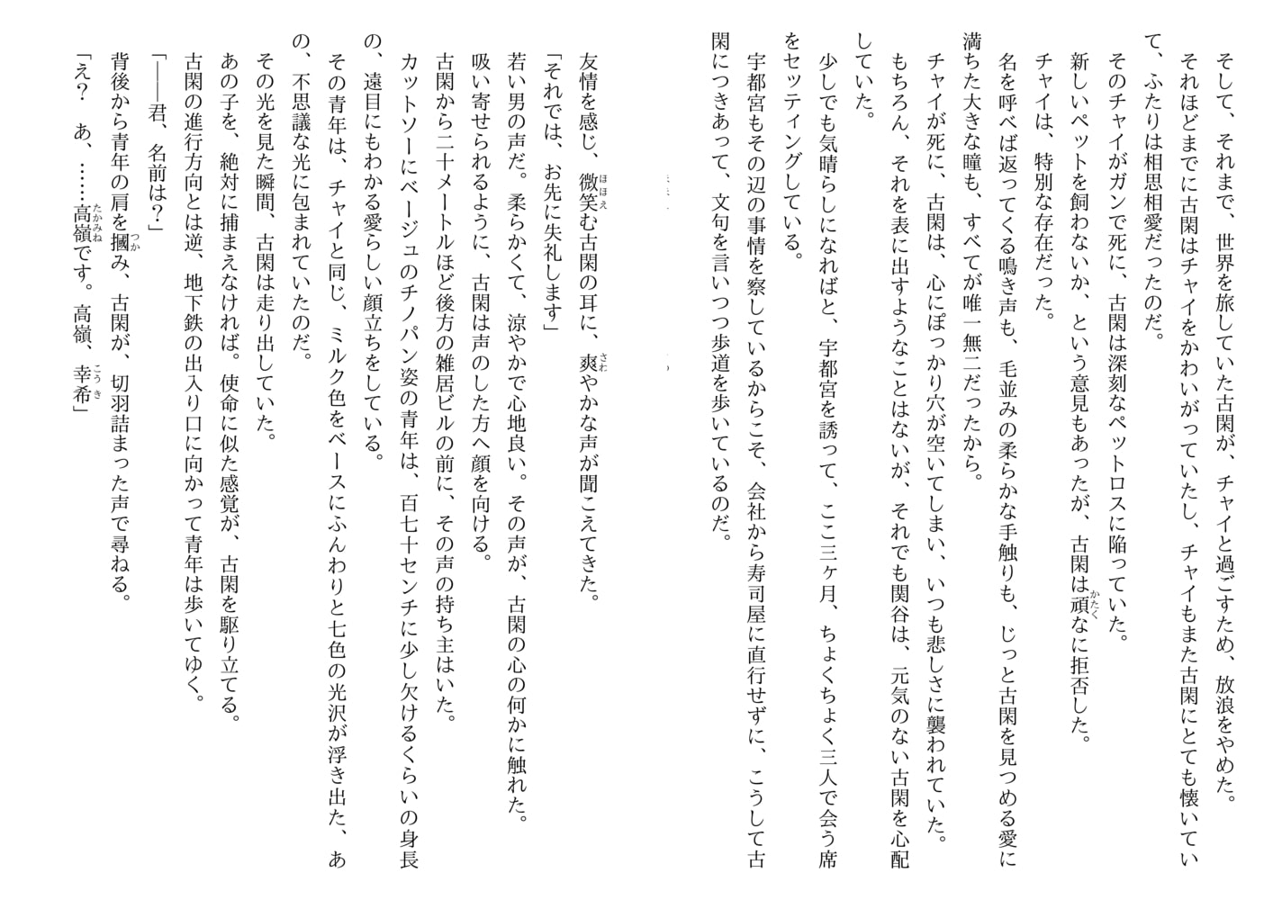 閑からのとんでもないバイトの話。それは、偶然見かけた幸希のオーラが、三ヶ月前に亡くした愛猫と同じだったので、一週間家に住み込んで自分のペットとして共に過ごしてくれないか…というもの。祖父の入院費に困っていた幸希は古閑の話を受け、奇妙な飼い猫生活が始まった。