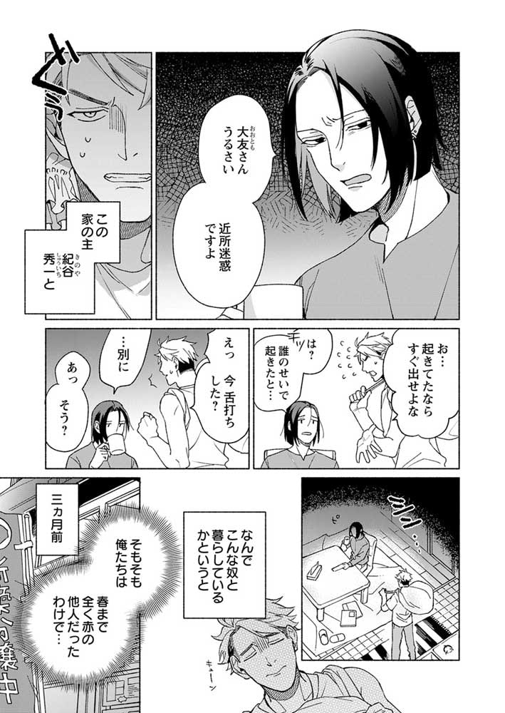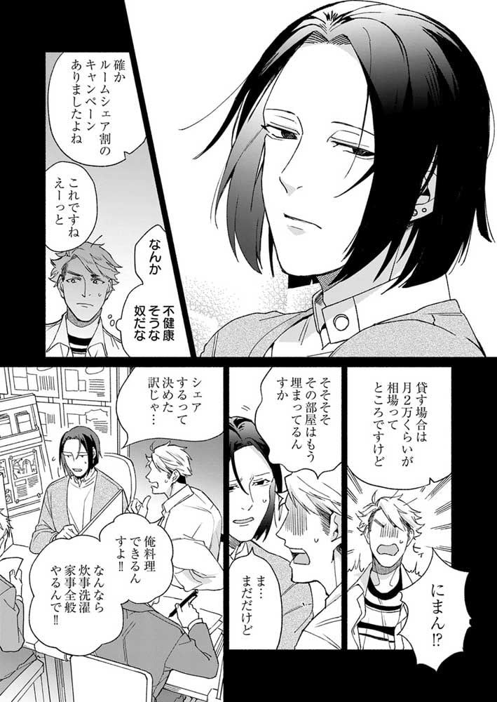 東京の下町・西日暮里駅から徒歩13分、2LDKのマンション。板前見習いの大友(おおとも)は、ここの大家で謎の住人・紀谷(きのや)とルームシェアしている。職業・謎、性格・謎、恋人の有無・謎…。少しでも打ち解けようと奔走する大友だったが、ひょんなことから、先にカラダの関係になってしまって――!? この関係はなんだ? まさか…恋、とか!? ひとつ屋根の下で繰り広げられる、男と男の不思議で濃密なシェアハウスラブ!