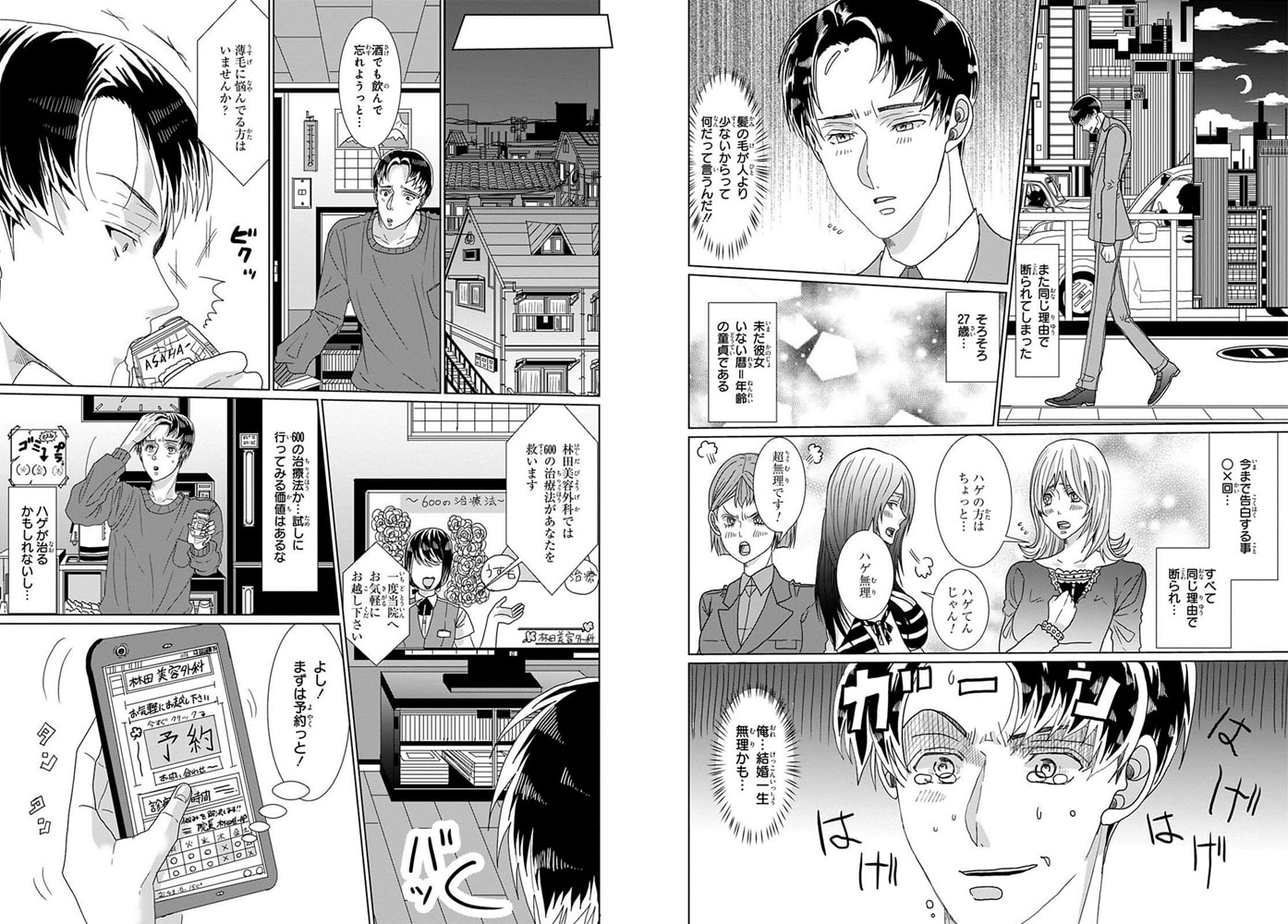 ※「メスイキホルモン増殖法」とは、髪の毛を生やすため乳首開発で胸を柔らかくし、メスイキを覚えることで女性ホルモンを増やすという治療法のこと。ハゲのせいで27歳になっても彼女いない歴=年齢の阿賀。このままじゃ一生童貞、永遠に結婚なんて…と絶望に暮れていた。このままじゃダメだ!と、まず診察を受ける事に。しかし阿賀の担当医は、フサフササラサラヘアーのイケメン先生!?こんな人が俺の気持ちなんて分かるわけない…と思っていたら、凄く真剣に向き合ってくれて。この先生に付いていく!と決めた瞬間、林田先生から「お尻を出して四つん這いになってください」と言われ!?穴を触られまさかの童貞の前に処女喪失の危機――!?