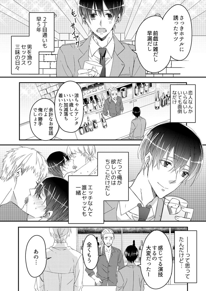 「イケよ。お前の恥ずかしい顔、全部見てやるから」毎日のように男をとっかえひっかえしていた淫乱ビッチな涼太。ある日、誘惑してホテルに連れこんだのはゲイバーで知り合った好みの童貞・正人。初めてだし俺がリードしてやるよ、ってチ○コを舐めたら意外にも反応が可愛くて!?もっとエロい顔が見たい…!と後ろをぐちゅぐちゅイジれば、さらにイイ声で喘いで乱れる正人にムラムラが止まらない。おまけに「気持ちいいから、やめないで…!」ってエッチにおねだりされたら、もう我慢の限界!気がつけば抱かれたい男の可愛いケツにずっぷり挿入しちゃってて…!?