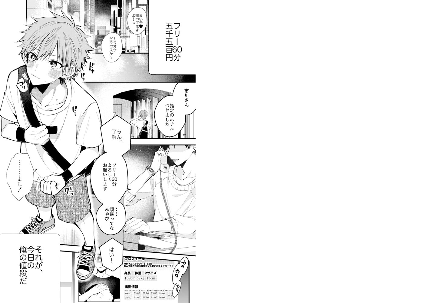 【60分5,500円、それが今日の俺の値段だ】男性向け風俗で“みやび”として働く雅紀(まさき)は、今日も体を張って性サービスを行う。辛いときもあるけど…お金に困っているときに自分を雇ってくれたお店のスタッフ・市川(いちかわ)が褒めてくれるから今日も頑張れる…!――性欲の溜まった客に毎日執拗にイジられてどんどん敏感になっていくカラダ…「アンタらは抜かせるのが仕事だろ」嫌だっ…こんな奴ので感じたくないのにっ…後ろの穴ゴリゴリされたら…あっやめっ!?――客の要求はどんどんエスカレートしていき…?