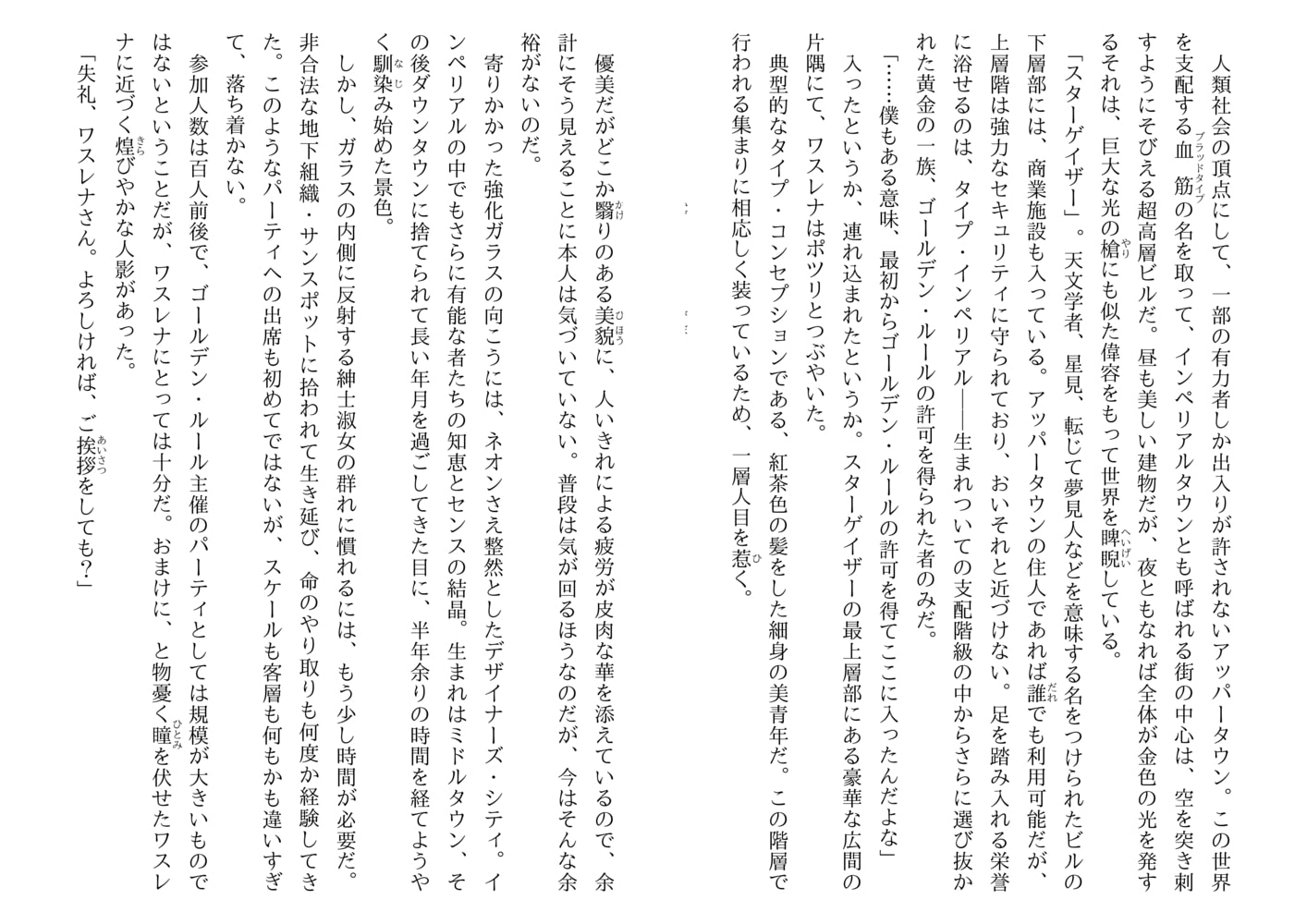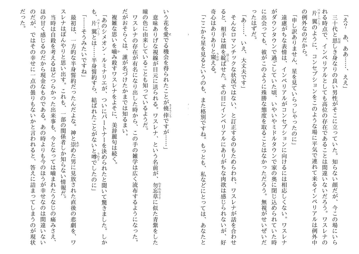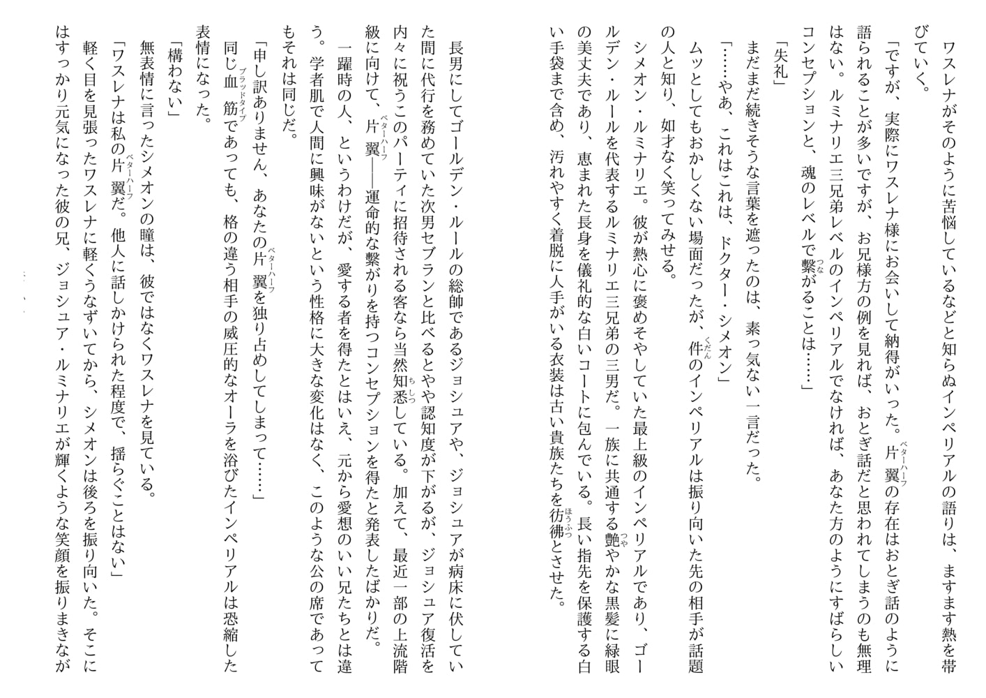 この世界の人間は、三つの血筋(ブラッドタイプ)に分かれている――「支配の血筋(タイプ・インペリアル)」の頂点に立つゴールデン・ルール一族の三男であるシメオンの片翼(ベターハーフ)となったワスレナ。愛を誓った二人だが、ワスレナの元主・ディンゴとその部下、そしてワスレナを慕うシメオンの「弟」が、二人の関係に溝を作り始める。そんな最中、三兄弟とそれぞれの片翼でバカンスを過ごすことに。関係を修復したいと願うワスレナ……だがシメオンから思わぬ言葉を――!?