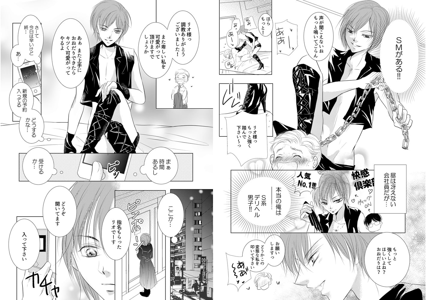 鬼上司にいつも怒られてばかりのデキない会社員・理央。密かな楽しみはSMデリヘルのお仕事!人気No.1のS男として、M男を調教してストレスを発散していた。ある晩、指名されてホテルへ行くと客はまさかの鬼上司!?バレたらヤバい!と焦るも、会社での姿とS男の衣装を着た理央の外見が違いすぎて全く気付いてない様子。しかも、イジメて欲しいって可愛い顔でおねだりしてきて…!?じゃあ、日頃の仕返しも兼ねてたっぷりイジメてヤるよ!と、縛りにオモチャに目隠しに…次々とハードなプレイで調教したら、どんどんエッチなカラダに仕上がっちゃって!?淫乱ドM上司が可愛すぎて、本番NGなのに奥までハメてメスイキさせたくなる…っ!