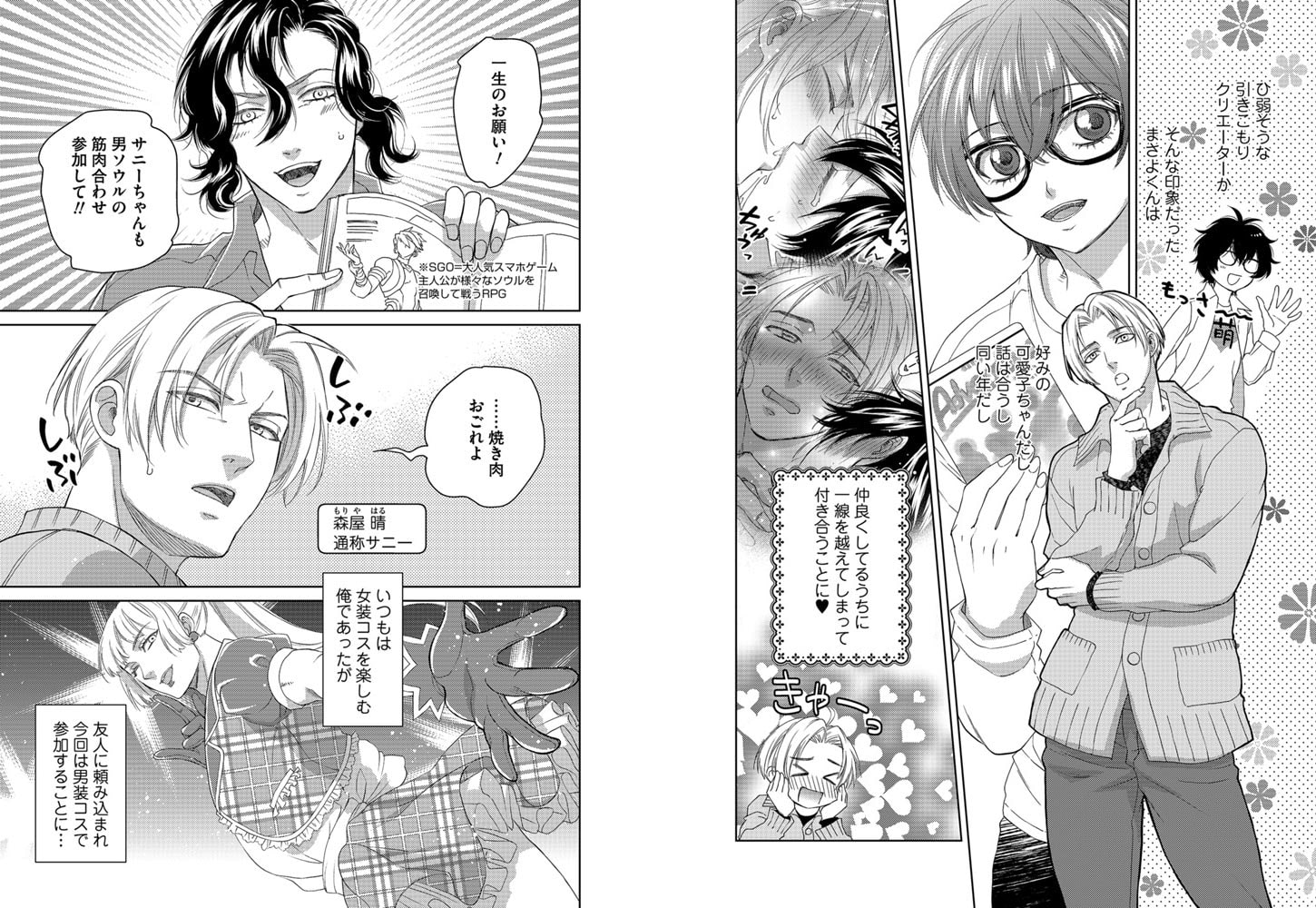 恋人でもありコスプレイヤーでもある晴が、いつもの女装コスプレではなくあえて男装コスプレとしてイベントに参加するというので、イベントへ出かけた雅良。晴が場を離れた時に、晴のコスプレ仲間たちに促されてしまい、いきおいで貸衣装のコスプレ服を着ることに!戻ってきた晴が、意外と周囲にウケてしまっている雅良を見て、嫉妬のかたまりになってしまい…