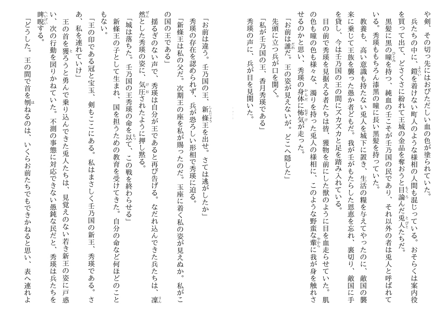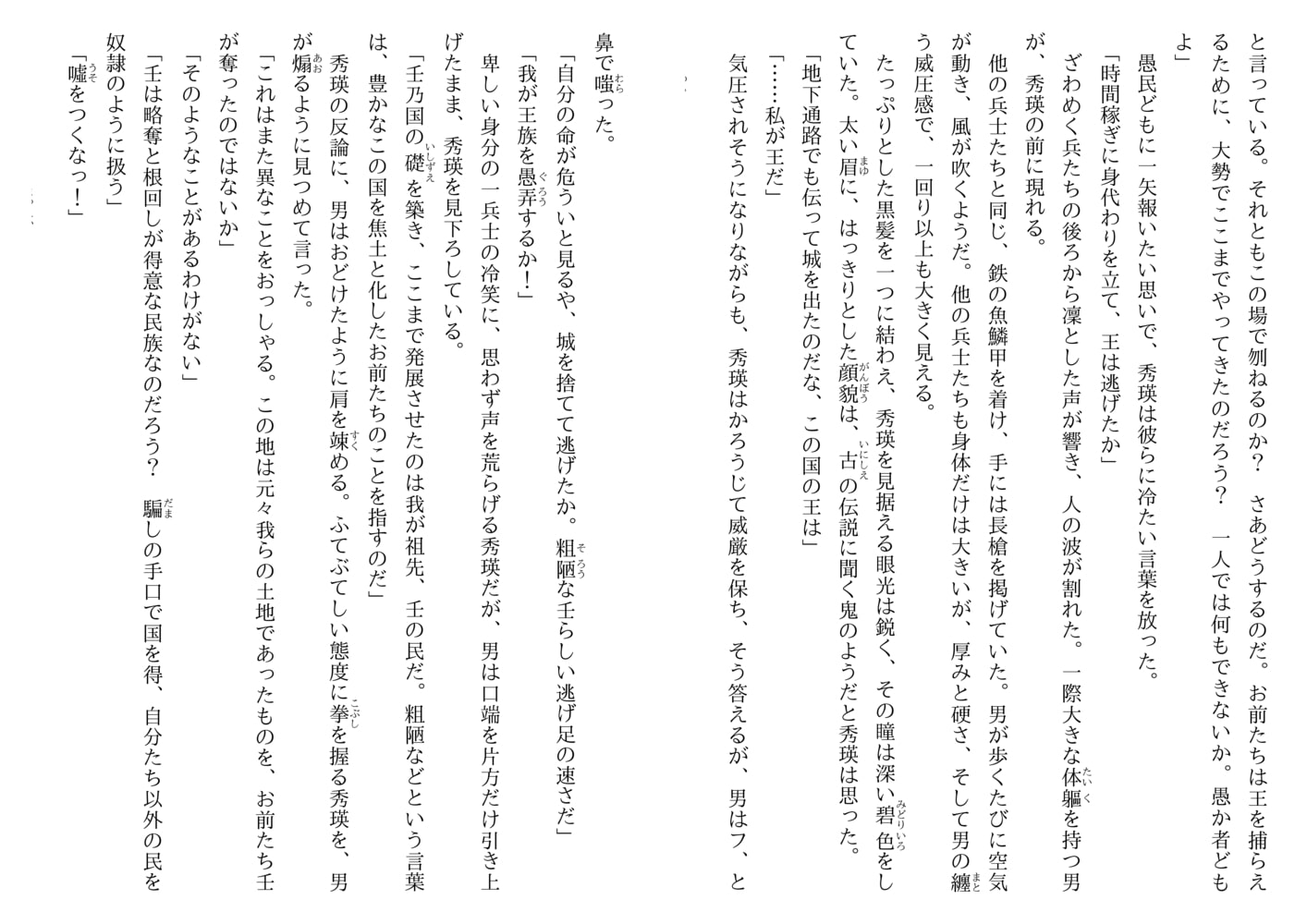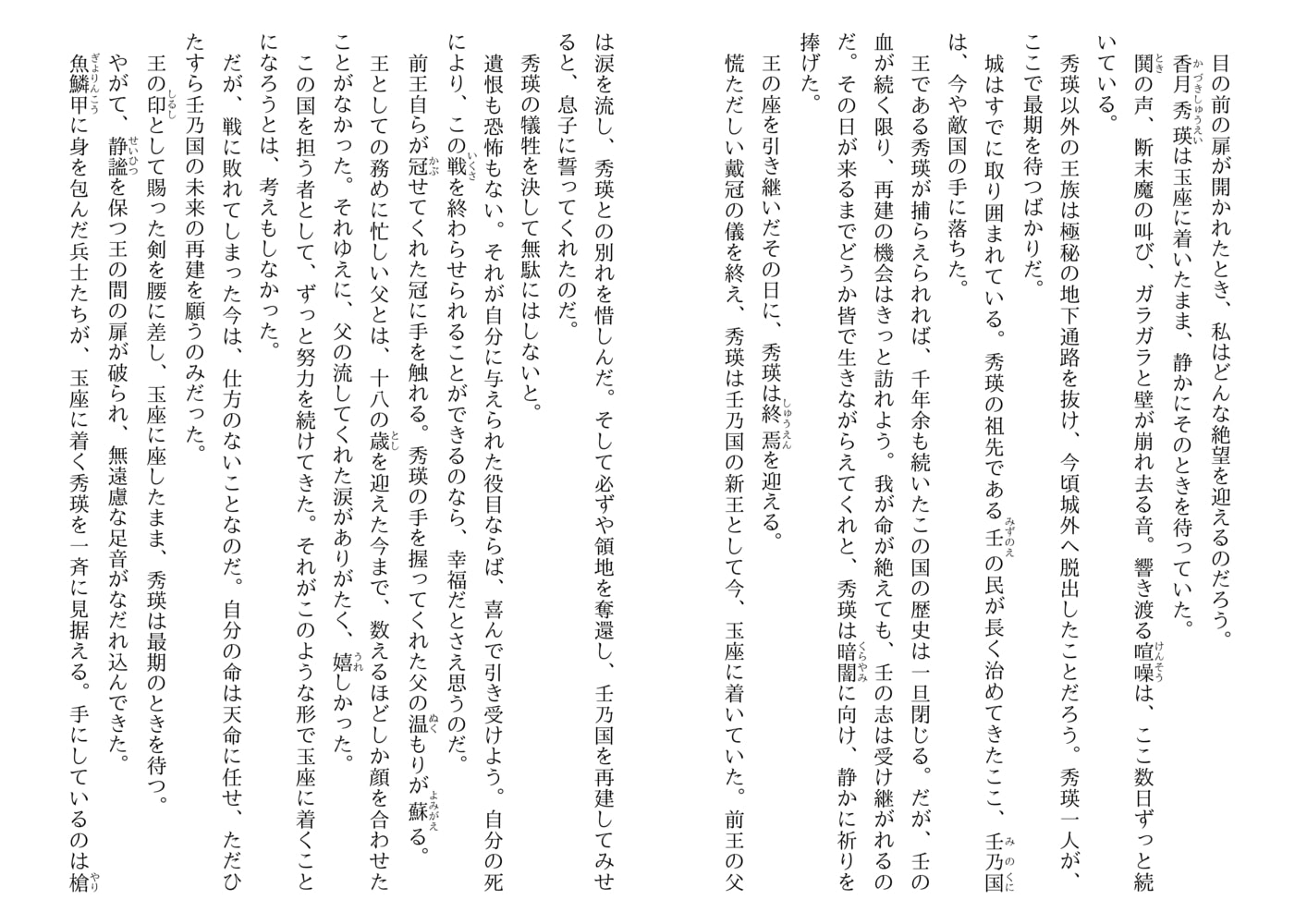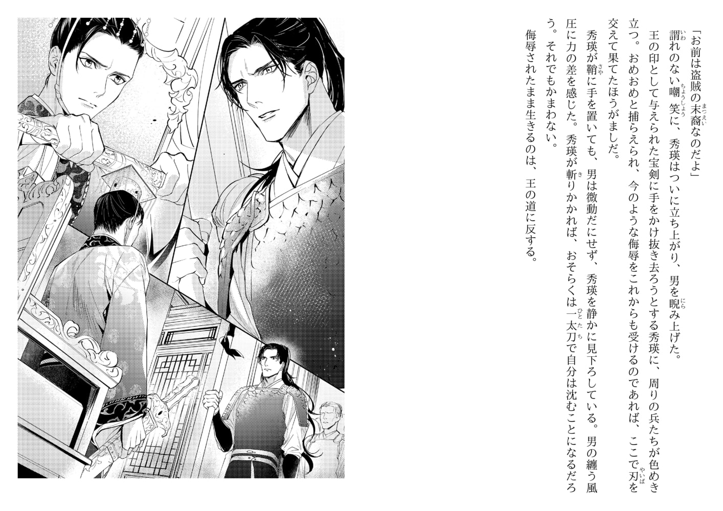 敵国・兎乃国に攻め入られ、ついに城陥落の日を迎えた壬乃国。その日、父王から引き継いで即位したばかりの壬乃国新王・秀瑛は人質として捕えられ、屈辱的な奴○生活を強いられることに。そんな秀瑛を窮地から救い、王城の離れに住まわせたのは兎乃国の若き王・瑞龍だった。豪快な気性で外交手腕にも長けた瑞龍と過ごす日々。幼い頃から洗脳教育を施され兎人を野蛮な民と蔑んでいた秀瑛は、やがて秘せられていた真実を知り…。