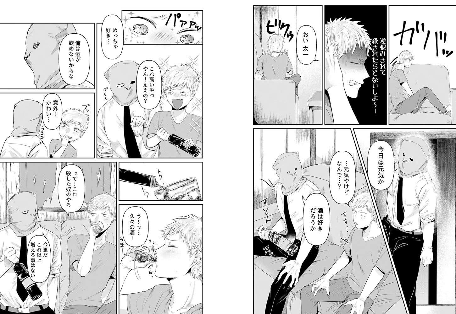 覆面殺人鬼に監禁されて処女を奪われました。─気が付くと知らない部屋で手足を縛られ監禁されていた太一。一人キャンプで殺人現場を見てしまい、殺人鬼に拘束されたらしい。俺の人生ここで終わりか…と思ったら耳を舐められた!なんやねん!かと思えば正面に椅子を置いて静かに見つめ始めた!ホンマになんやねん!!拘束を解かれたと思えば「惚れた」!?俺も殺しの対象ちゃうんかーーーい!!!!何とか逃げ出そうと自分も惚れたと嘘を吐いたら、いきなりデカすぎるアレを突っ込まれて!?慣らされていないせいで痛いはずなのに、どんどん気持ちよくなってきて…「声…抑えるな」アカン…はよ…イって…っ!覆面殺人鬼と関西人の歪な同居生活が今始まる!!