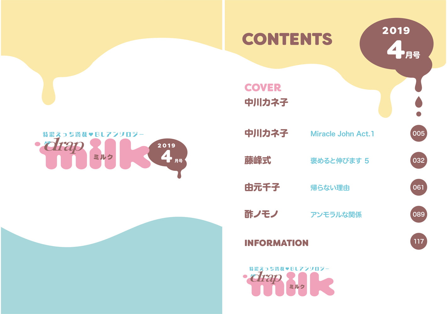 drapmilkはオール描き下ろしマンガ掲載★ 俺はお前だけ見えてればいい――ナマAVショー開幕★★ 中川カネ子「Miracle John Act.1」まずいとは思うが、やめたいとは思えない異常な行為――それは、環の「ナマAV」ショーを目の前で見ること! 見るだけで満足していたけれど、ある日の夜、環とふたりっきりになって…!?!? 藤峰式「褒めると伸びます 5」Sっ気のある金岡主任に「褒められる」と「勃起」してしまうエロいカラダになった藤田。ご褒美セックスで仕事も頑張れていたけれど、金岡が他の男とラブホテルに入るところを目撃してしまう…! 由元千子「帰らない理由」「先生のせいで白衣着た相手にじゃないと勃起しなくなった…っ!」上京する前、透先生が男とセックスするのを目撃してしまった志貴。大人になって、透先生と再会した瞬間、感情がかき乱されて――! 酢ノモノ「アンモラルな関係」キャバクラの呼び込みバイトで苦戦していた誠也は、やっと超イケメンの太客をGET! そんなイケメンの晴樹と連絡先を交換したら、なぜかラブホに連れ込まれて!? 顔が好みすぎて抗えない~~!! 今月号は、中川カネ子先生「Miracle John」の表紙が目印★
