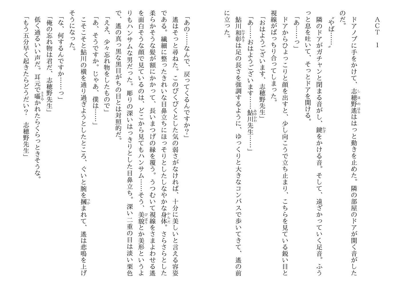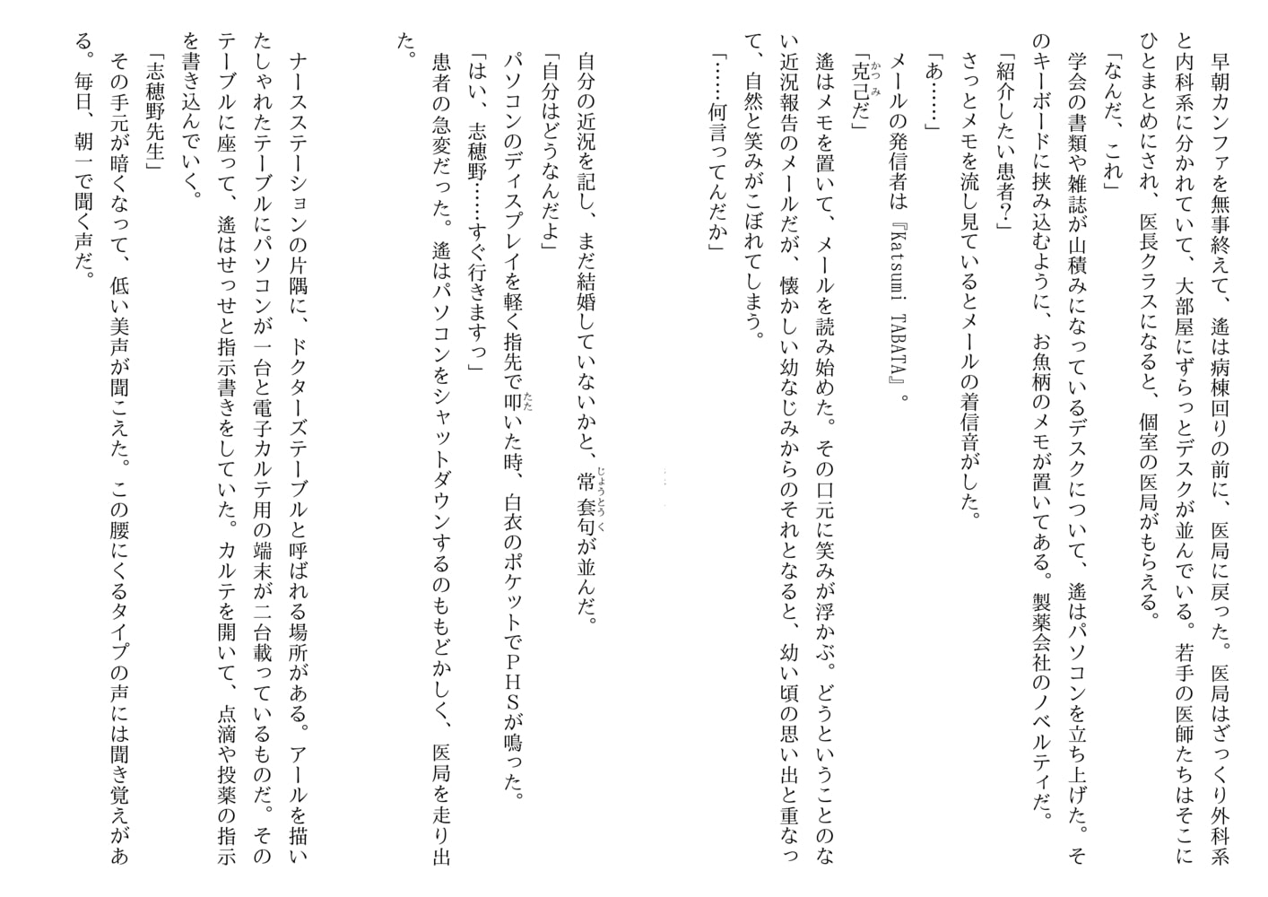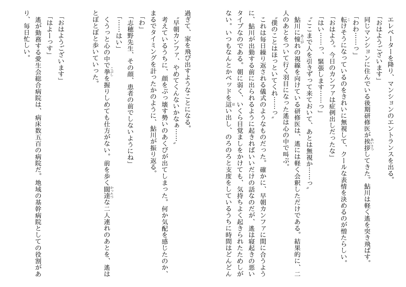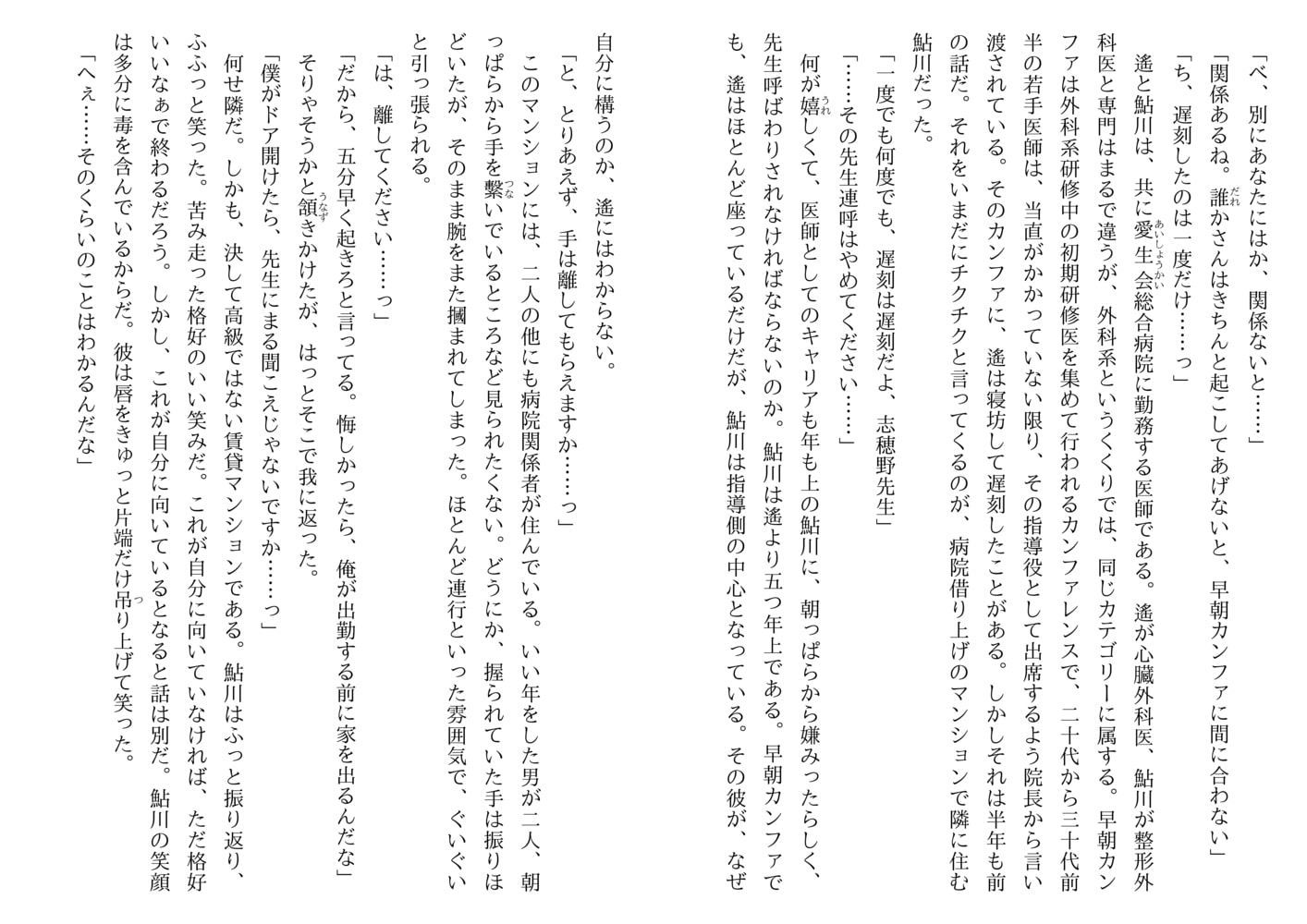 引っ込み思案で人づきあいが不得手な心臓外科医の志穂野遙。そんな遙が最も苦手な相手…それは病院借り上げのマンションの隣人、整形外科医の鮎川和彰だ。クールなハンサム、腕は立つが性格ドSの鮎川に遙は毎日おびえっぱなしである。ある日のこと。帰宅した遙はマンションの入口で六歳の男の子、光紀に遭遇。パパである鮎川に会いに来たと言う光紀。鮎川は独身だったはずだが…? ドクター&ドクターのワケあり子育て騒動。