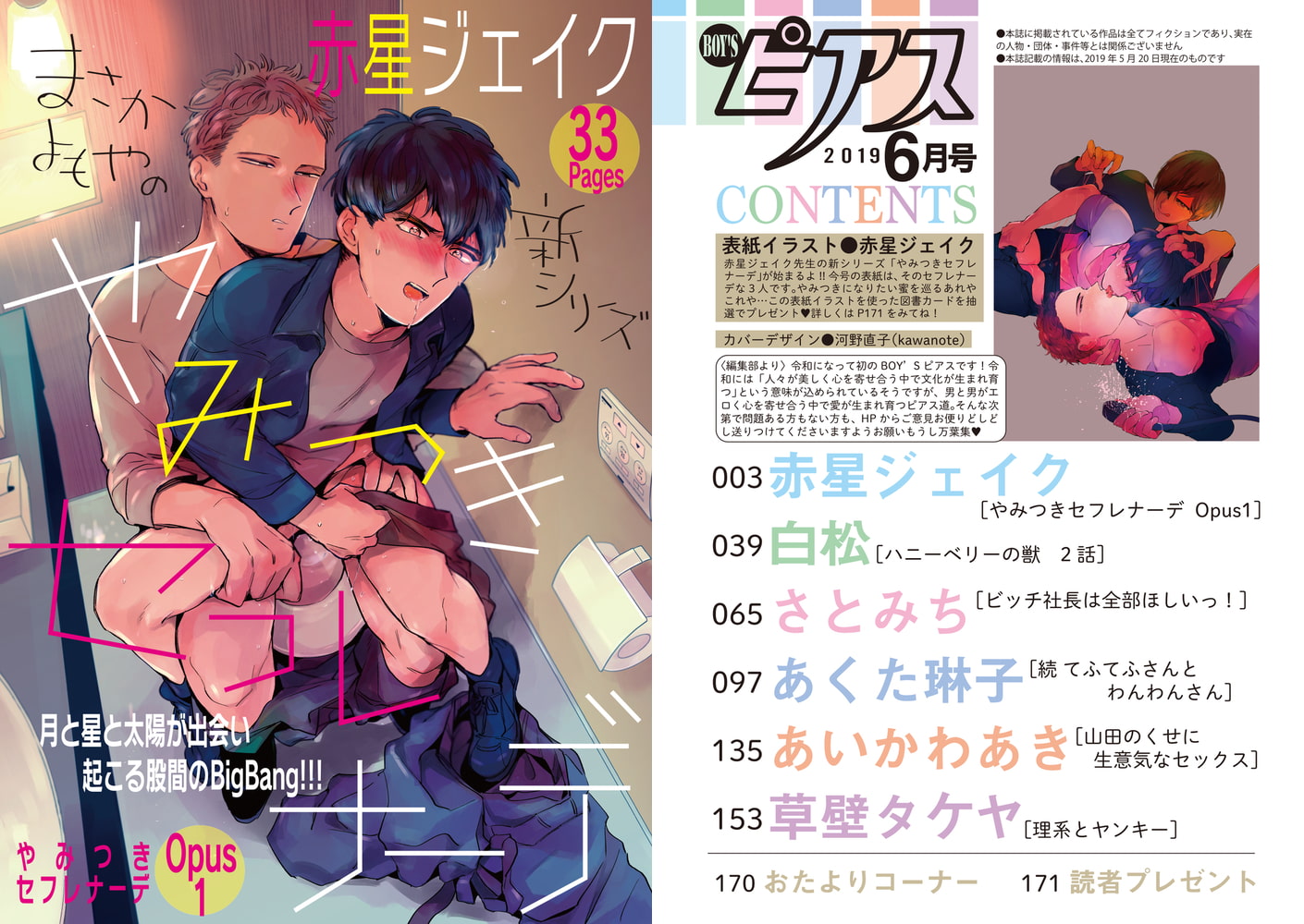 ●今号の表紙は赤星ジェイク先生!図書カードの抽選プレゼント企画あります。応募締切は2019年6月20日。詳しくは本誌を見てね。