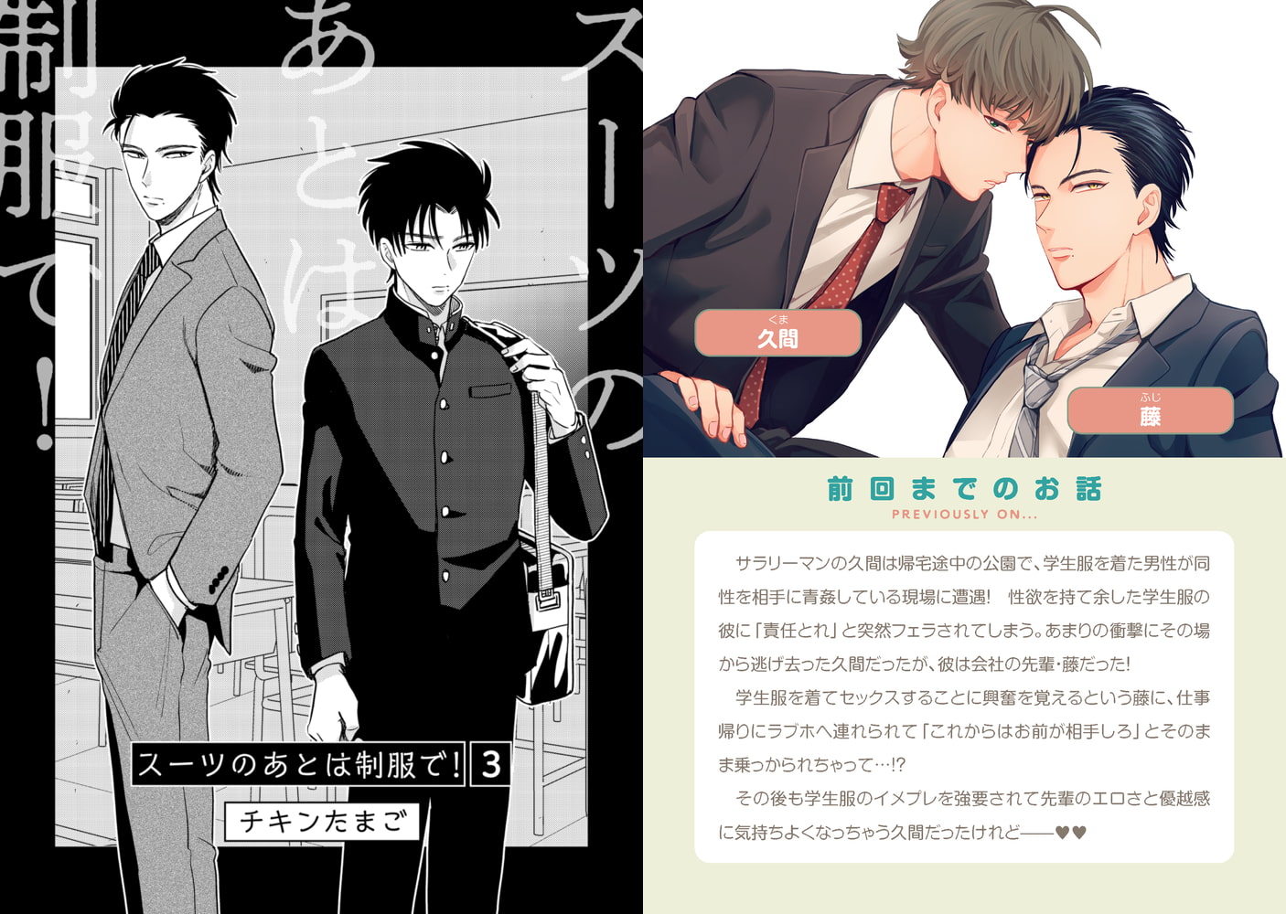 drapmilkはオール描き下ろしマンガ掲載★ 今月はエロ特大強化号!! エッチ大増量中★ チキンたまご「スーツのあとは制服で!3」“今日はこのまま抱かせてください” 藤の青姦プレイを邪魔してしまった久間はセフレ関係に★ 淫らな関係を続けていたけれど、藤が初恋の男と自分を重ねていると気づき…? 椿野イメリ「追う恋追われる恋4」運命の恋を探している理央は、センと出会い「気持ちいいセックス」を教えてトロトロに★ 突然目の前から消えてしまったセンとようやく再会し、秘密の場所で深く繋がる二人は…! 坂井ヤスト「ヒミツの個別指導」恋人ができず一人アナニーが日課の早川は、ジムに通って自分磨きをすることに! そこで出会ったトレーナー・井澤が超絶イケメンで、ついつい勃起しちゃって!? 今月号は、チキンたまご先生の藤&久間の表紙が目印★