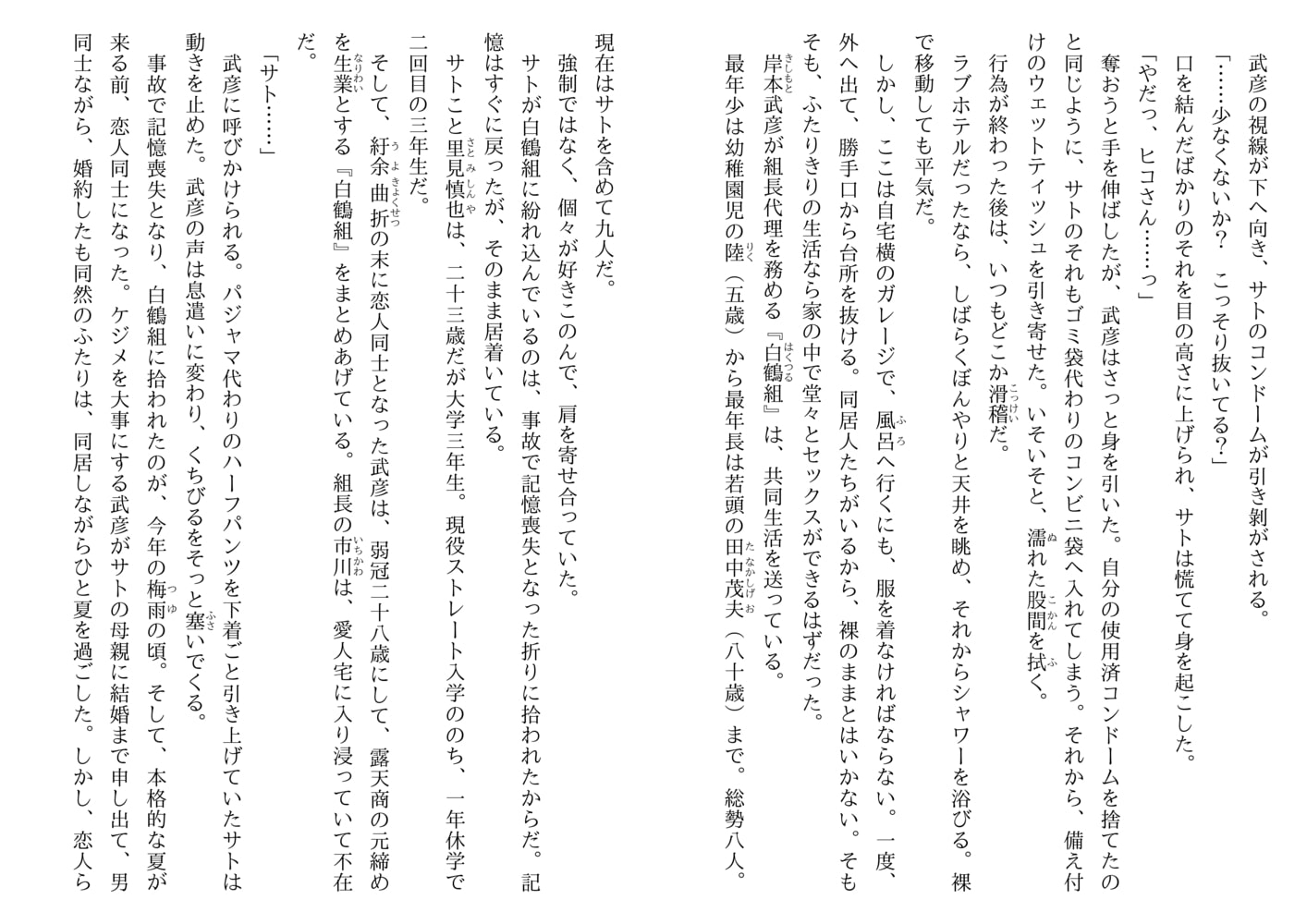 白鶴組はテキ屋の元締め。幼稚園児の陸から八十歳のジジィまで総勢八人が共同生活を送る『はぐれ者の集まり』だ。ひょんなことからそんな白鶴組に拾われた大学生のサトは、紆余曲折の末、組長代理の武彦と結ばれ九人目の同居人となった。今では陸の送り迎えから家事全般…とまさに一家の若妻さん。だが男所帯ゆえ武彦とのエッチもままならないという悩みも…。秋祭りの間近のそんな折、武彦が代目を継ぐ継がないで一悶着が…。