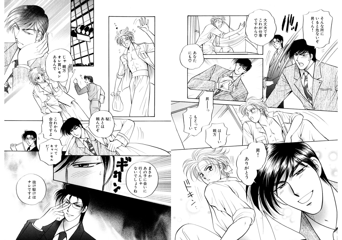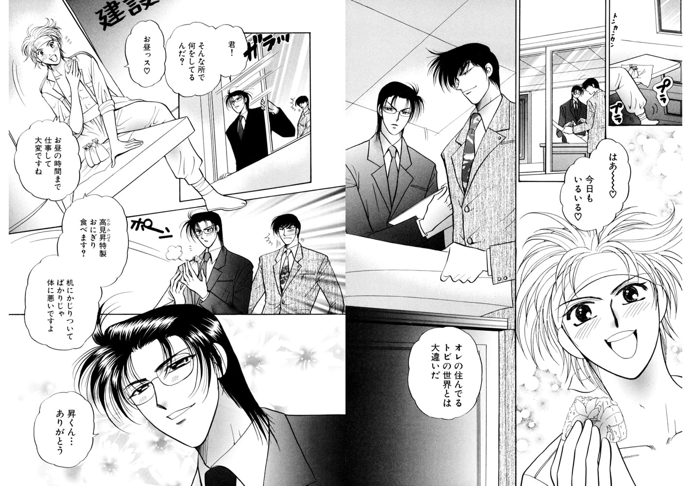 『オレ・高見昇は鳶職人。今日も大好きな空の近くで楽しく仕事にはげんでます! 実は、オレには最近気になって仕方がない人(達!!)がいるんだ。現場から見えるビルの一室で働く、スーツ姿もキマってる2人。一流企業でシゴトもバリバリにこなしてそうで、たまらなく憧れちゃう。なんとか話してみたいなぁ。…でも、きっとオレなんて相手にもされないよね。住む世界が違うって感じ? あーあ…。』ある日突然、最高級の男2人に求愛されちゃったら!? どーなるシンデレラ・トライアングルラブ☆