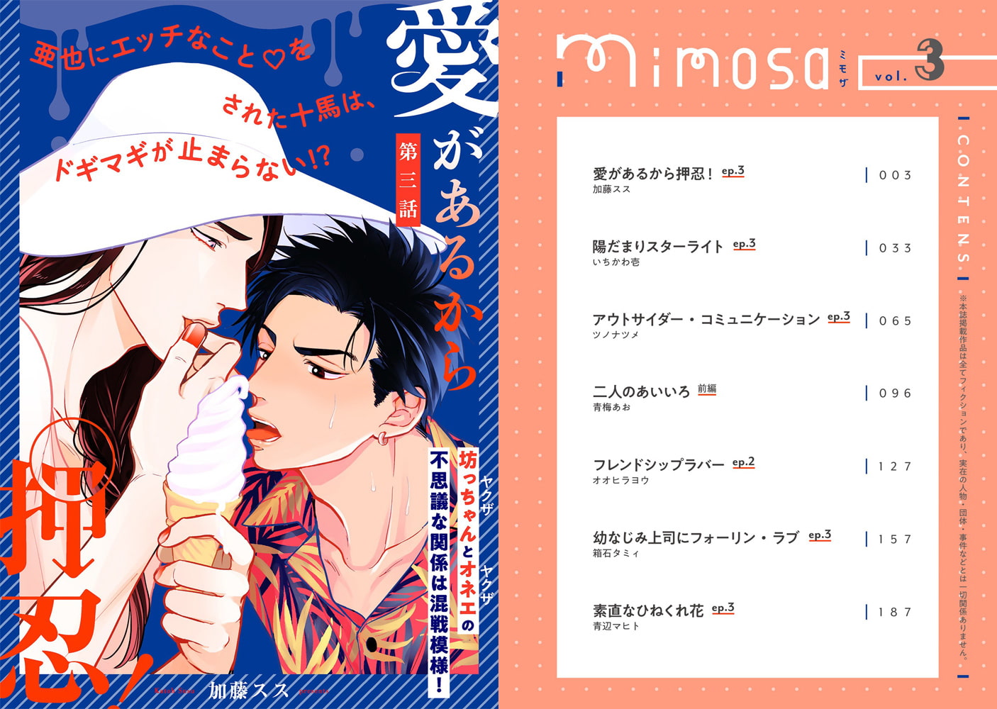 幸せな恋を詰めこんだBLマガジン『mimosa』vol.3、表紙は加藤ススの「愛があるから押忍!」。亜也の手コキでイかされた十馬は、亜也への気持ちを整理できず…付き人と坊っちゃんの関係はますます混戦模様!