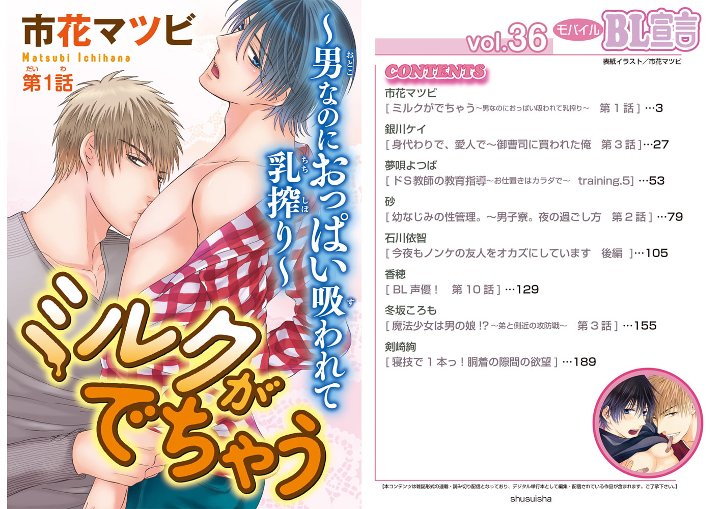 【モバイルBL宣言vol.36】表紙&巻頭カラーは市花マツビ先生『ミルクがでちゃう~男なのにおっぱい吸われて乳搾り~』誰にも言えないヒミツ…それは男なのに○○がでちゃう!?他、豪華連載は、銀川ケイ先生『身代わりで、愛人で~御曹司に買われた俺』、夢唄よつば先生『ドS教師の教育指導~お仕置きはカラダで~』、砂先生『幼なじみの性管理。~男子寮。夜の過ごし方』、石川依智先生『今夜もノンケの友人をオカズにしています』香穂先生『BL声優!』、冬坂ころも先生『魔法少女は男の娘!?~弟と側近の攻防戦~』。読み切りは剣崎絢先生『寝技で1本っ! 胴着の隙間の欲望』