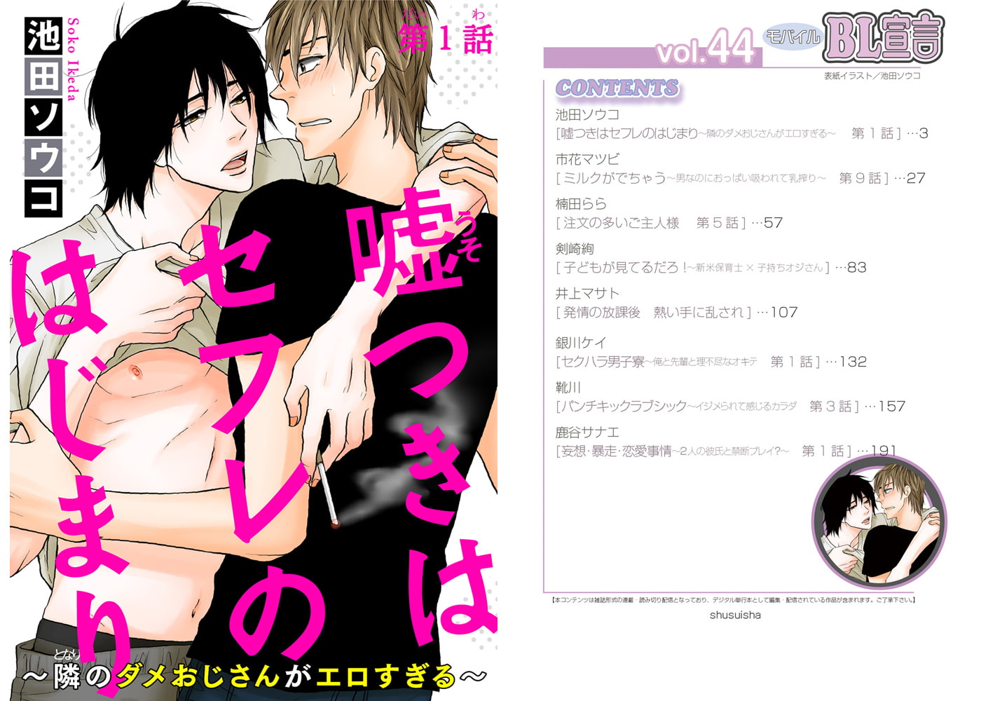 【モバイルBL宣言vol.44】表紙&巻頭カラーは池田ソウコ先生『嘘つきはセフレのはじまり~隣のダメおじさんがエロすぎる~』ノンケ青年×エロいおじさんの年の差ラブストーリー。ほか豪華連載は、市花マツビ先生『ミルクがでちゃう~男なのにおっぱい吸われて乳搾り~』、楠田らら先生『注文の多いご主人様』、銀川ケイ先生『セクハラ男子寮~俺と先輩と理不尽なオキテ』、靴川先生『パンチキックラブシック~イジメられて感じるカラダ』、鹿谷サナエ先生『妄想・暴走・恋愛事情~2人の彼氏と禁断プレイ?~ 鹿谷サナエ』、読みきりは剣崎絢先生『子どもが見てるだろ!~新米保育士×子持ちオジさん』、井上マサト先生『発情の放課後 熱い手に乱され』。
