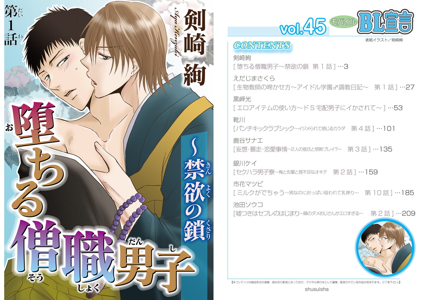 【モバイルBL宣言vol.45】表紙&巻頭カラーは剣崎絢先生『堕ちる僧職男子~禁欲の鎖』住職の息子に襲われて――僧侶同士の禁断ラブ!。ほか豪華連載は、えだじまさくら先生『生物教師の啼かせ方~アイドル学園♂調教日記~』、靴川先生『パンチキックラブシック~イジメられて感じるカラダ』、鹿谷サナエ先生『妄想・暴走・恋愛事情~3人の彼氏と禁断プレイ?~』、銀川ケイ先生『セクハラ男子寮~俺と先輩と理不尽なオキテ』、市花マツビ先生『ミルクがでちゃう~男なのにおっぱい吸われて乳搾り~』、池田ソウコ先生『嘘つきはセフレのはじまり~隣のダメおじさんがエロすぎる~』、読みきりは黒岬光先生『エロアイテムの使い方~ドS宅配男子にイかされて~』
