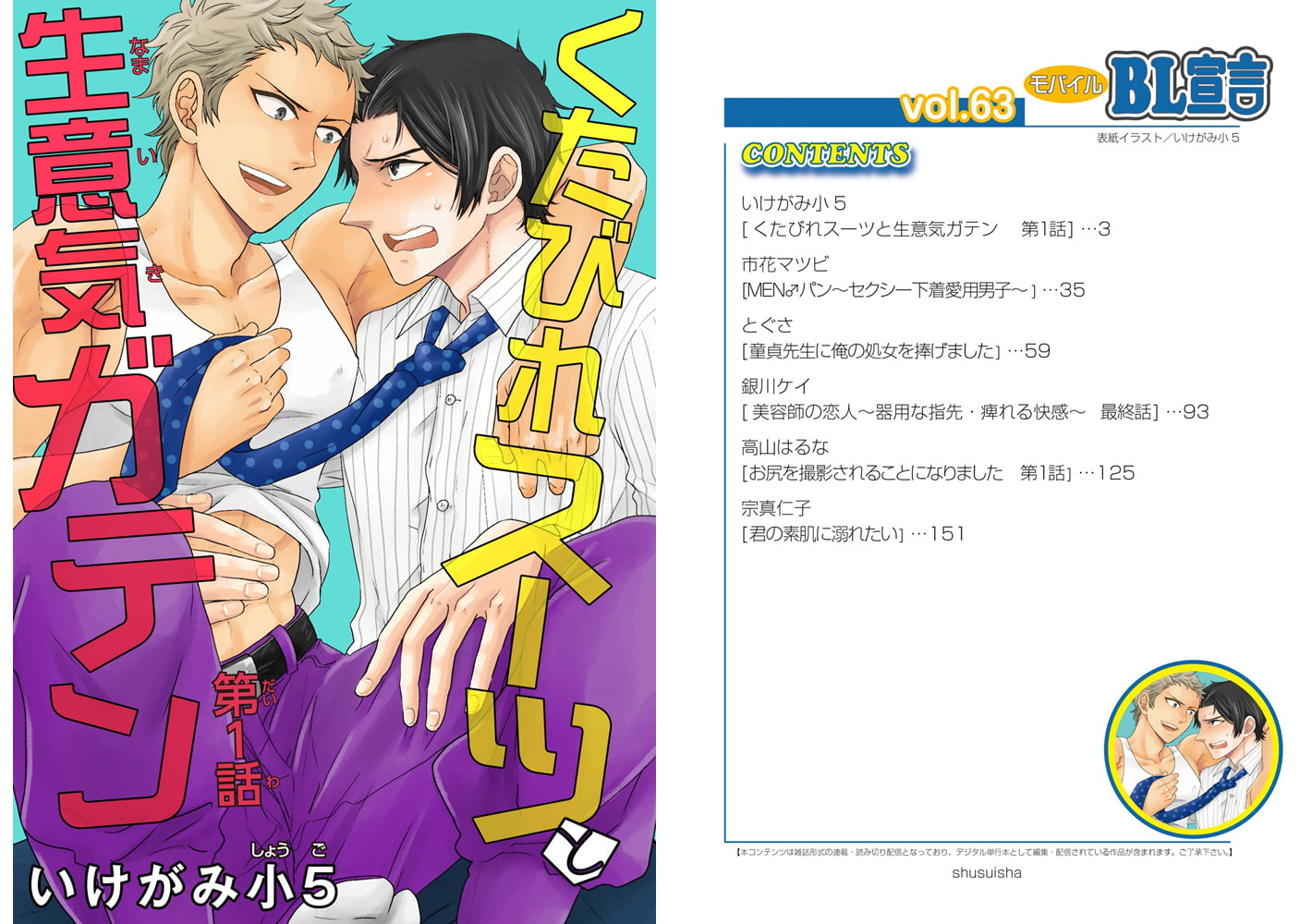 【モバイルBL宣言vol.63】表紙&巻頭カラーはいけがみ小5先生『くたびれスーツと生意気ガテン』ヘタレリーマン×天然ツンデレの年の差ラブ!ほか豪華連載は市花マツビ先生『MEN♂パン~セクシー下着愛用男子~』、とぐさ先生『童貞先生に俺の処女を捧げました』、銀川ケイ先生『美容師の恋人~器用な指先・痺れる快感~』、高山はるな先生『お尻を撮影されることになりました』、宗真仁子先生『君の素肌に溺れたい』