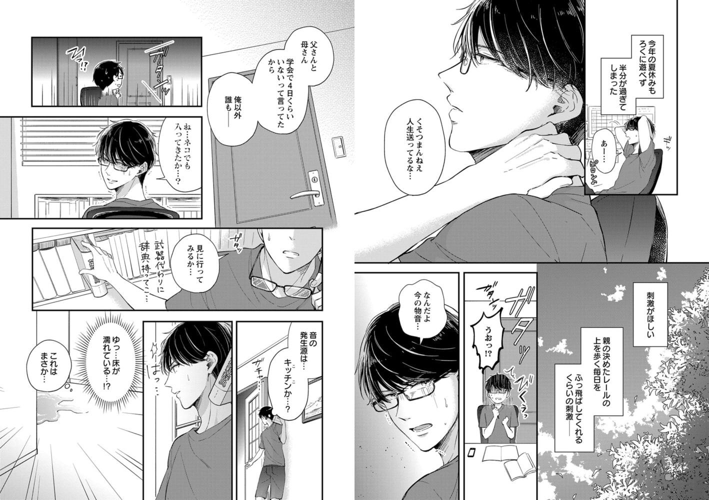 両親が留守にしている4日間だけ住み込みでやってきた、ちょっとドジでエッロい家政夫のお兄さん・旭さんは、掃除をすれば水をブチ撒け、あちこちにぶつかりまくっては物を壊すポンコツっぷり。そのくせ仕草がいちいち艶っぽくて、なんだか妖しい雰囲気を醸し出している。すげー綺麗な顔して濡れたシャツ越しの乳首は勃ってるし、気づいたら全裸にエプロン姿……って、まさかの変態!?