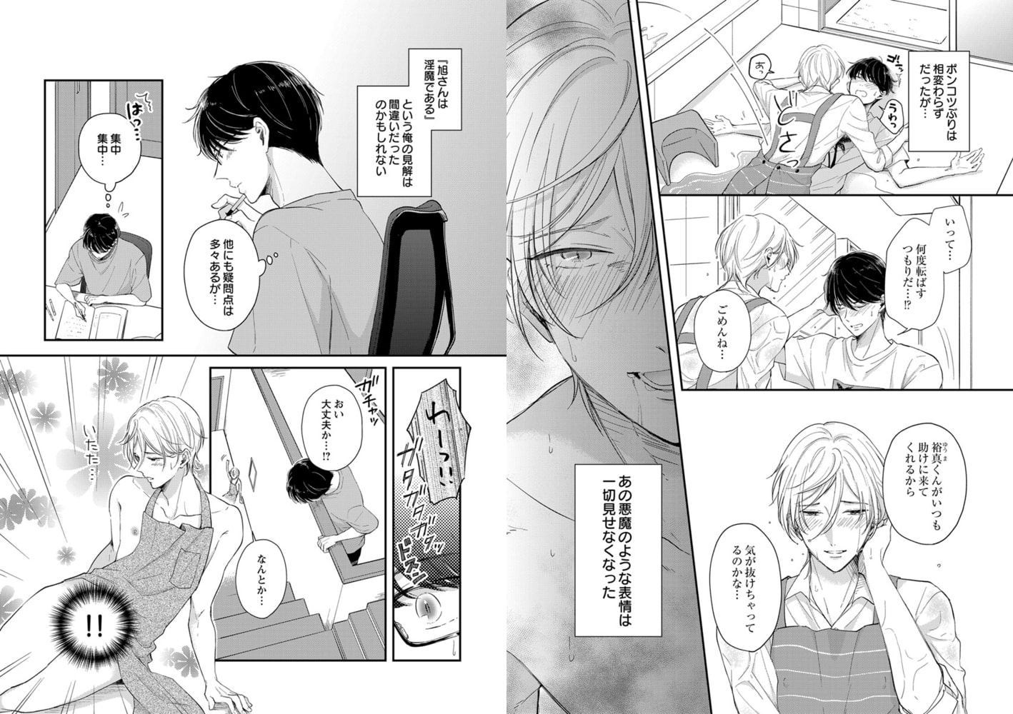 両親が留守にしている4日間だけ住み込みでやってきた、ちょっとドジでエッロい家政夫のお兄さん・旭さんは、掃除をすれば水をブチ撒け、あちこちにぶつかりまくっては物を壊すポンコツっぷり。そのくせ仕草がいちいち艶っぽくて、なんだか妖しい雰囲気を醸し出している。すげー綺麗な顔して濡れたシャツ越しの乳首は勃ってるし、気づいたら全裸にエプロン姿……って、まさかの変態!?