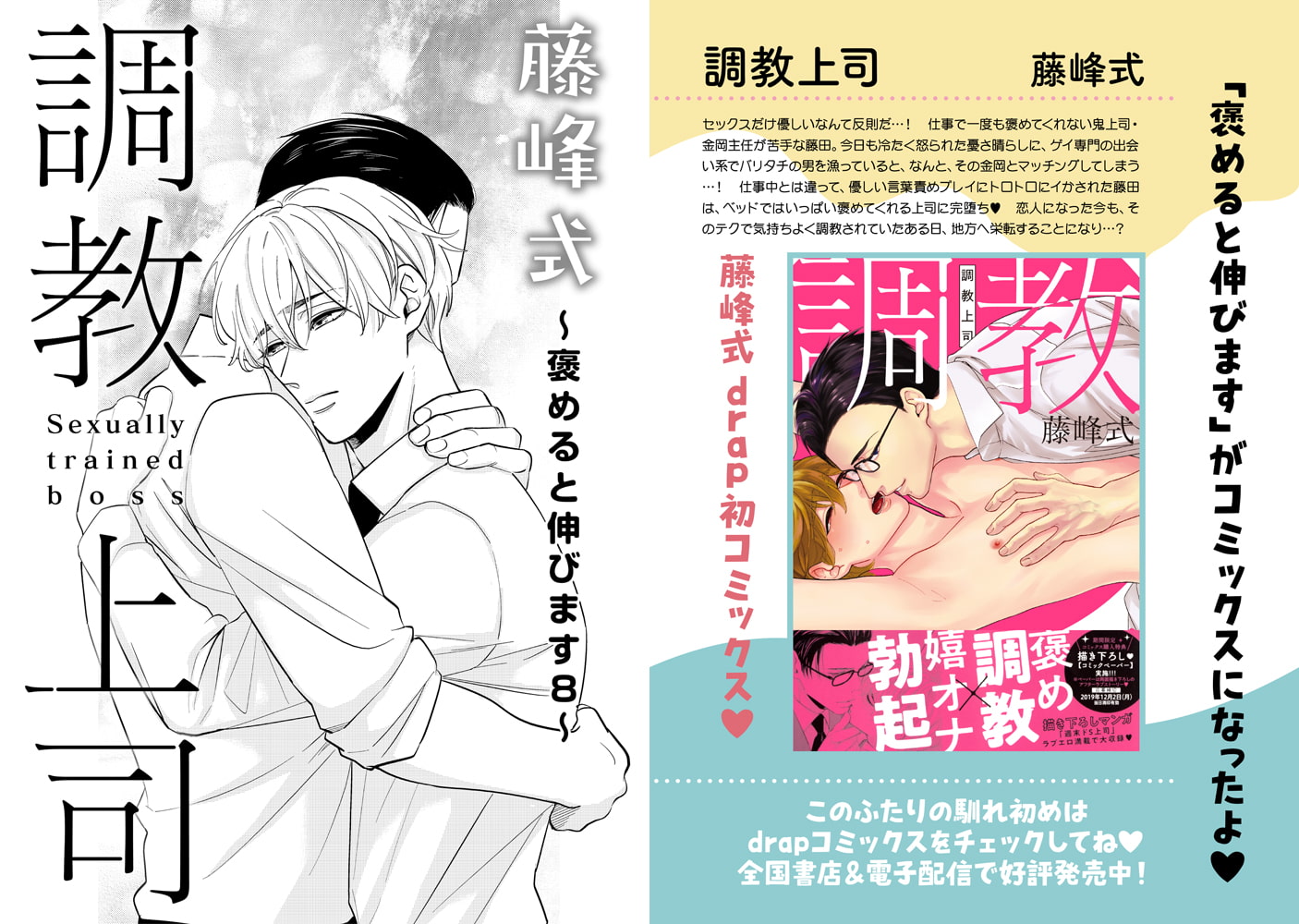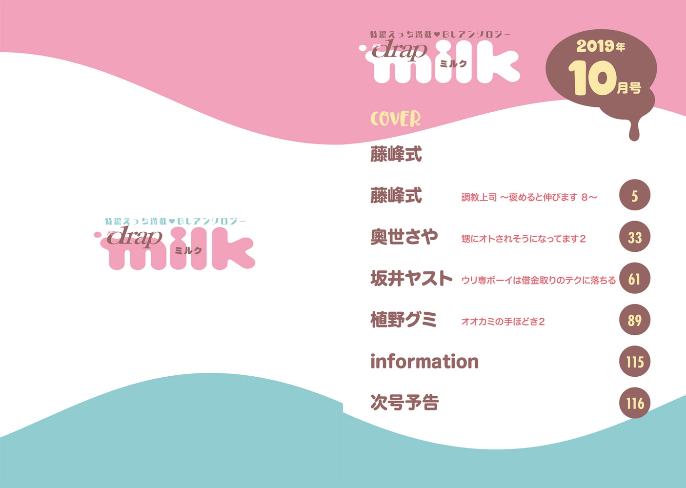 drapmilkは創刊7周年!!! オール新作!描き下ろしマンガで、エロあま★たっぷりお届け!!! 藤峰式「調教上司 ~褒めると伸びます8~」褒めて伸ばすドS上司×褒められて勃起する藤田くん、恋人になってからの二人の我慢できないエッチ生活は!? コミックス「調教上司」のその後が読める!! 奧世さや「甥にオトされそうになってます2」同棲中の甥っ子が、おじさん相手に毎日性欲を爆発させてきて…!? 若さ溢れる大学生から10年分の愛を注ぎ込まれて、心も身体もトロットロに…★ 坂井ヤスト「ウリ専ボーイは借金取りのテクに落ちる」ウリ専・いずるは、ウザい客に絡まれたところを借金取りのみずきに助けられる。客とはセックスするだけの完全割り切りだったのに、超テクにハマっちゃって!?!? 植野グミ「オオカミの手ほどき2」強引で傲慢な若社長・鑑に、夜な夜な呼び出されてはセックスの気持ちよさに抗えない松浦。そんなある夜、仕事ができないくらい激しく抱かれてしまい…? 今月号は、藤峰式先生の表紙が目印★ drap初コミックスdCDX「調教上司」が好評発売中! チェックしてね★