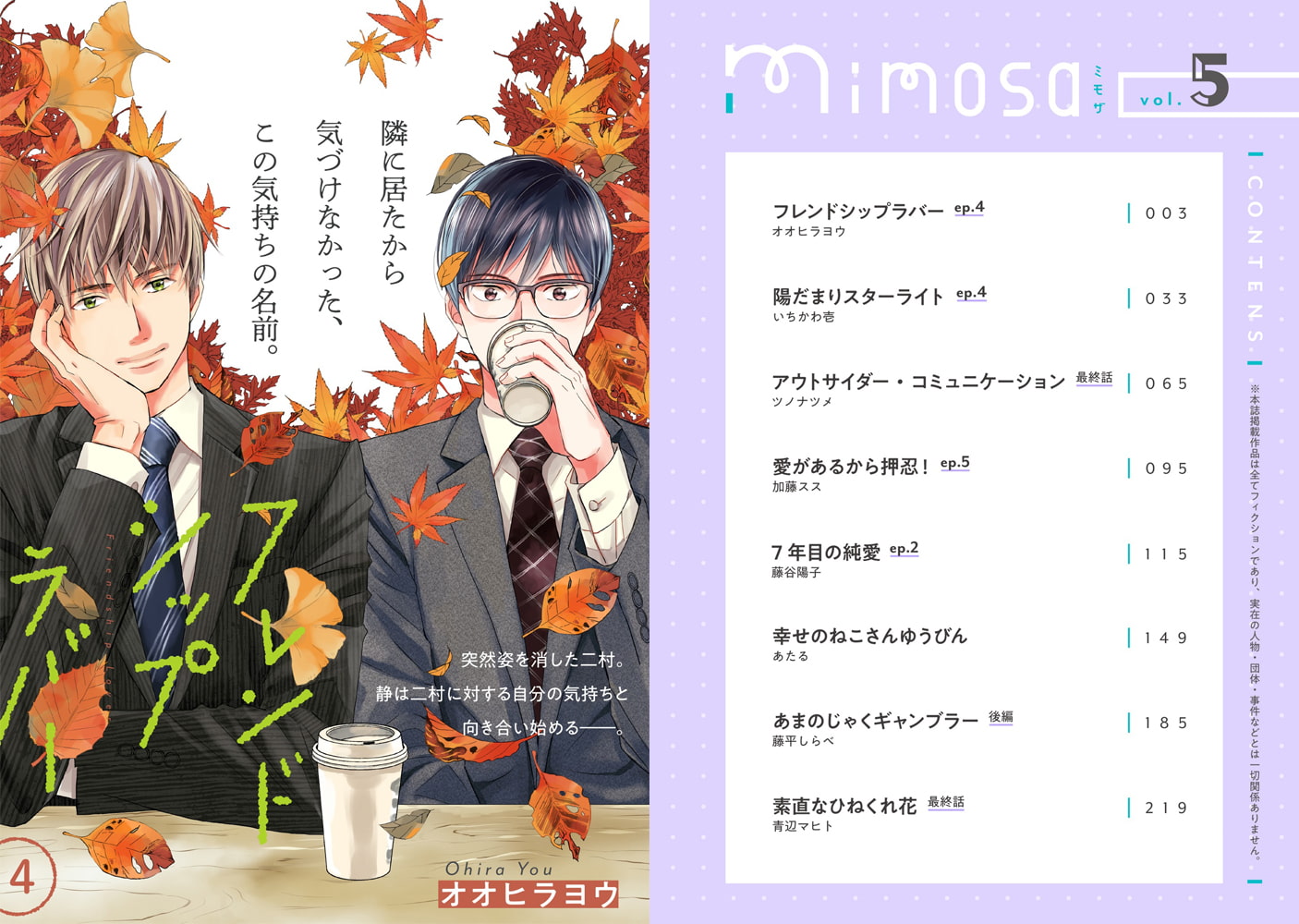 幸せな恋を詰めこんだBLマガジン『mimosa』vol.5の表紙はオオヒラヨウ「フレンドシップラバー」。