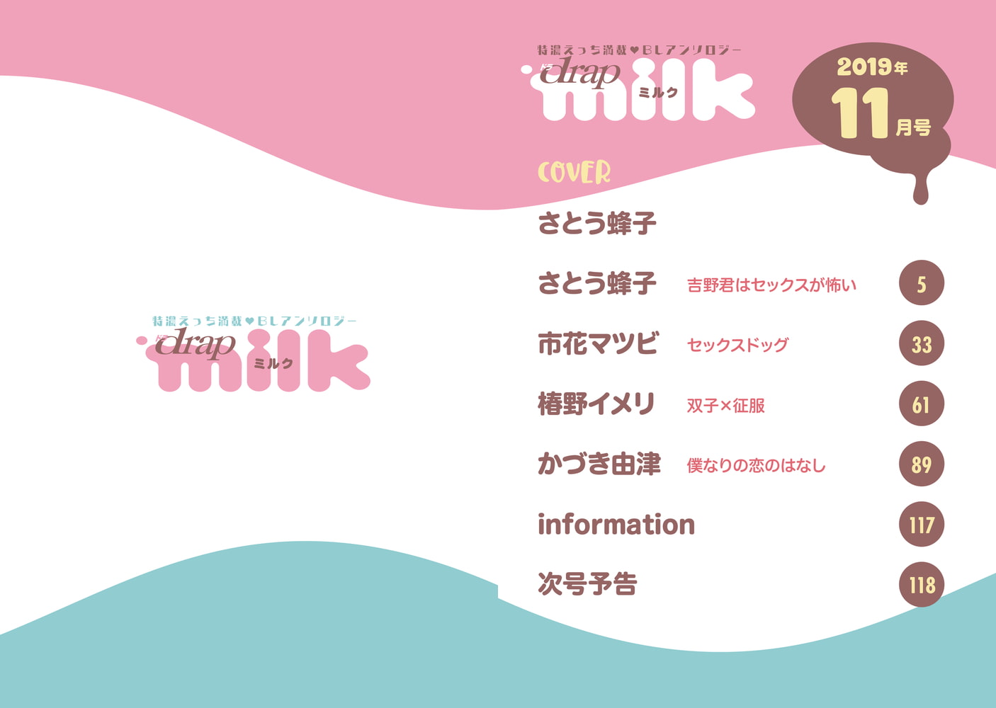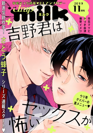 新連載ゾクゾク! ウリ専・コスプレエッチ・身体でご奉仕・幼馴染みラブ・オール新作!描き下ろしマンガで、エロあま★たっぷりお届け!!! さとう蜂子「吉野君はセックスが怖い」新宿二丁目にあるゲイバーには、限られた顧客しか知らない裏メニューがある。それは手と口でお客様を気持ちよくイかせること! バーテン・吉野君は、ご贔屓の御門さんからお尻を狙われていて!? 市花マツビ「セックスドッグ」「ワンコは待てができない」シリーズが待望のdrapコミックス化! コミックス発売を記念して、えろえろたっぷりの描き下ろし番外編を掲載★ 今回はコスプレエッチでトロトロになっちゃう! 椿野イメリ「双子×征服」堂坂一族のはみ出し者・ルミは毎夜遊び倒していたある日、父親が借金を残して海外に高飛びしてしまう…! 富豪からいきなり文無しになったルミの前に「体で払え」と傲慢な双子が現れて──。 かづき由津「僕なりの恋のはなし」“セックスのときの声聞きたい”──幼馴染みの『声』に恋をしている夏晴は、詞の声を聞くだけで、興奮するように。アノ時の声が聞きたくて、お願いしたらヌき合いできることになって…!? 今月号は、新進気鋭作家・さとう蜂子先生の新作表紙が目印★
