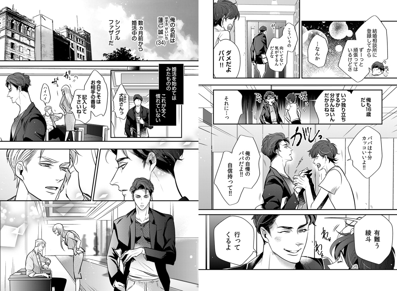 「綺麗ですね…蓮己さんの乳首、目の色素と一緒で薄いピンク色だ」「恥ずかしいよ…気にしてるんだから…っ」ってあれ?お酒のせいかな、今すっごいト゛キト゛キしてる……ーーデザイナーでシングルファザーの蓮己誠一(はすきせいいち)は、息子の勧めで一念発起して婚活中。しかし愛息子への溺愛っぷりが空回りし、マッチする相手に中々出会えない日々を過ごしていた。そんなある日、同じ婚活パーティーに出席していた若くてエリートの犬飼と意気投合し、あれよあれよという間に深い仲に…。息子のため必死に仕事とパパを頑張りながら、実は誰かに甘えてみたい…と思っていた中、魅惑的な言葉で誘われ、今までにない心地良さを感じるも、次第に互いに抱えた悩みが明るみに…腹黒ダークエリート攻×ピュアで大人なハスキー受!?な胸キュン必須な恋☆