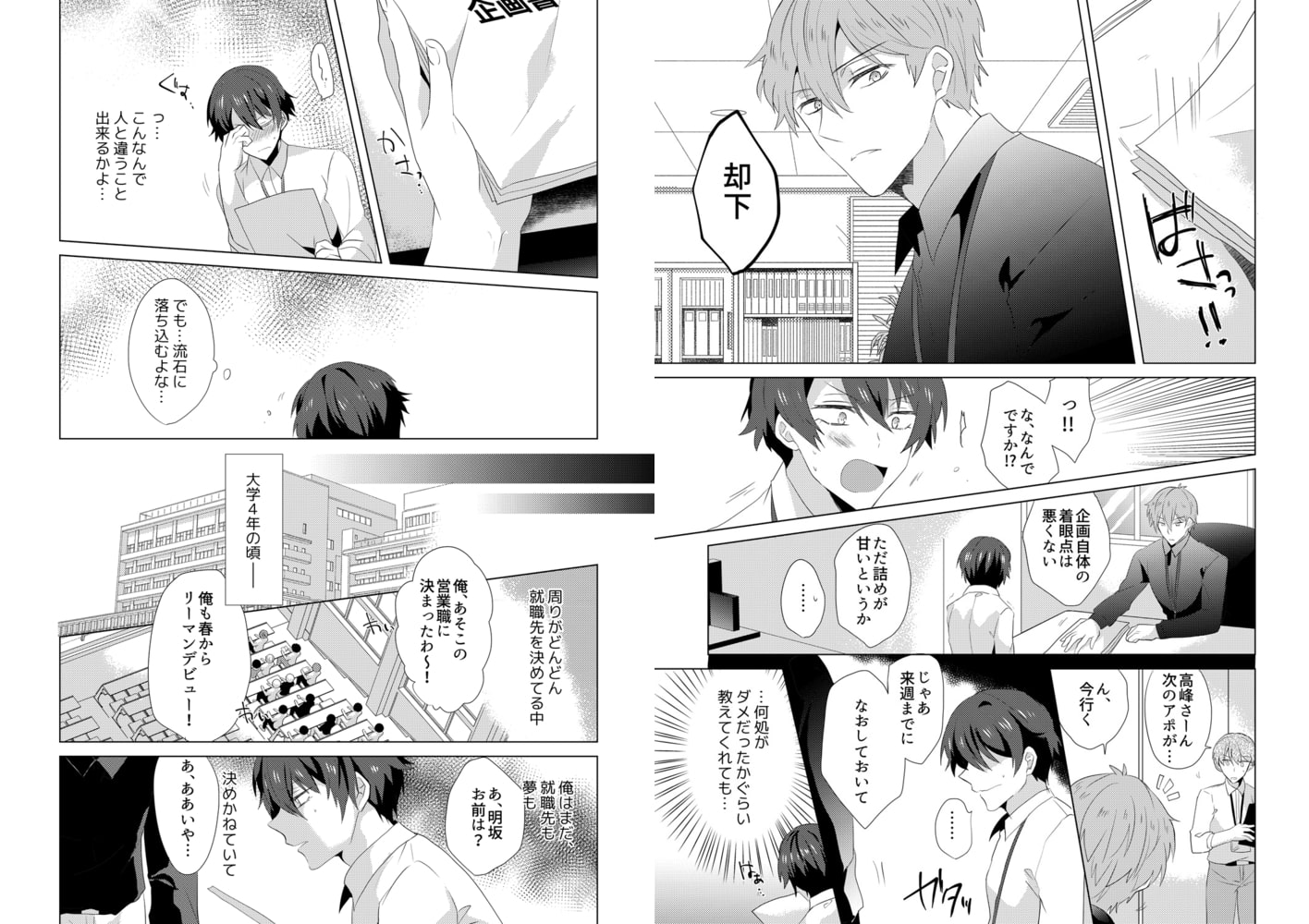「ほら、カラダは気持ちいいって言ってるよ?」アダルトグッズの制作会社に就職したばかりの陸。開発メンバーとして頑張りたいのに、なぜか変人上司・高峰に気に入られて毎日うんざり…。ボディタッチは多いし口説かれるし…俺ノンケだから、そっちの気なんか無いっての!そんなある日、高峰からピンクローターのテスト係に任命されてしまう。仕事だし割り切ってやろう!そう思ってたのに…ローターを乳首に当てられた瞬間、アソコがずくんと疼いちゃって!?最初は感じてないフリをしてたけど、高峰の手はどんどんエスカレート。執拗に勃ちかけた股間をバイブで責めれられたら…我慢デキなくてもう、イクッ!弄られるうちに感度も良くなっちゃって…俺がオモチャにされるとか、嘘だろ!?