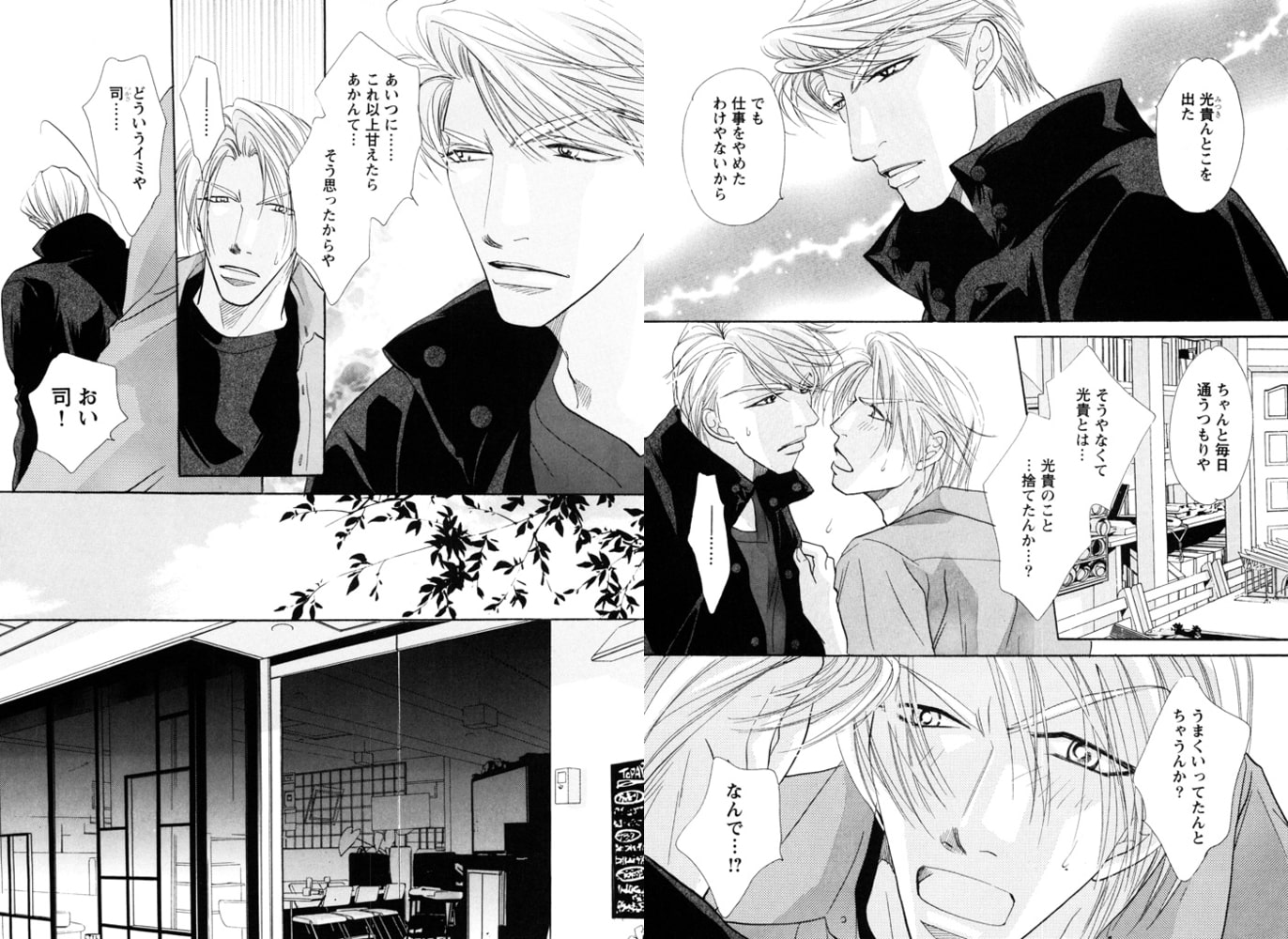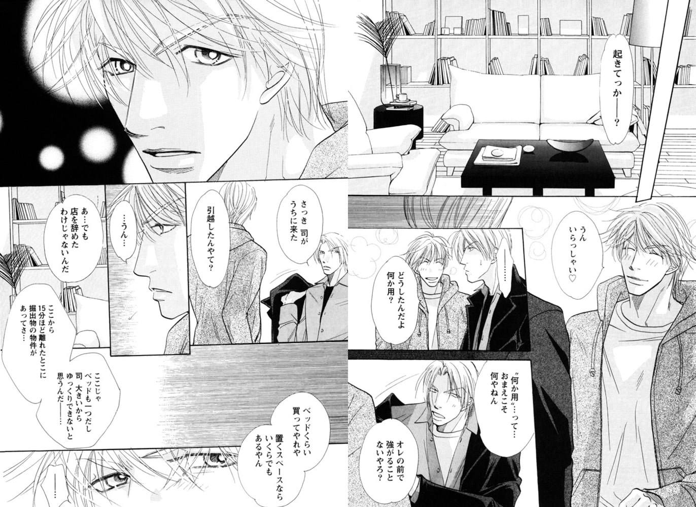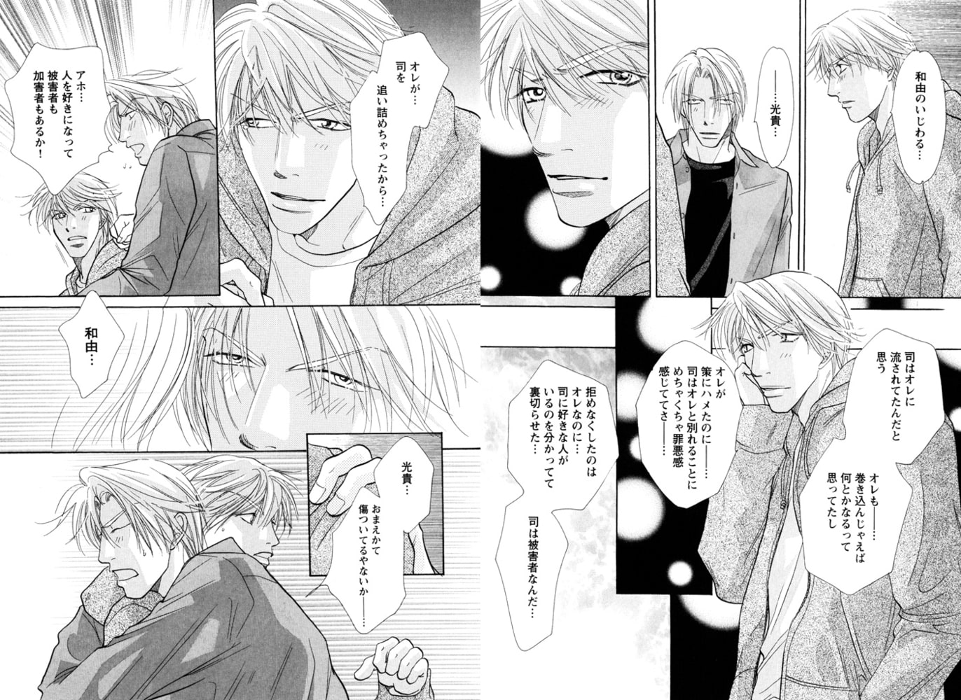 高校時代の初恋、そして初体験相手の男・秀一への想いを引きずったまま、野球への夢と恋に破れた司。大阪から東京へと流れ着いたところ、仕事現場で偶然、秀一と再会し、さらに彼の部屋に居候することに。しかもそこは秀一が生涯の恋人と決め、愛しあう男・和由と同棲中の愛の巣で…!? 昔の恋、そして今の恋が錯綜し、大騒ぎ! オトナな男たちの激しく淫らなBLラブストーリー!