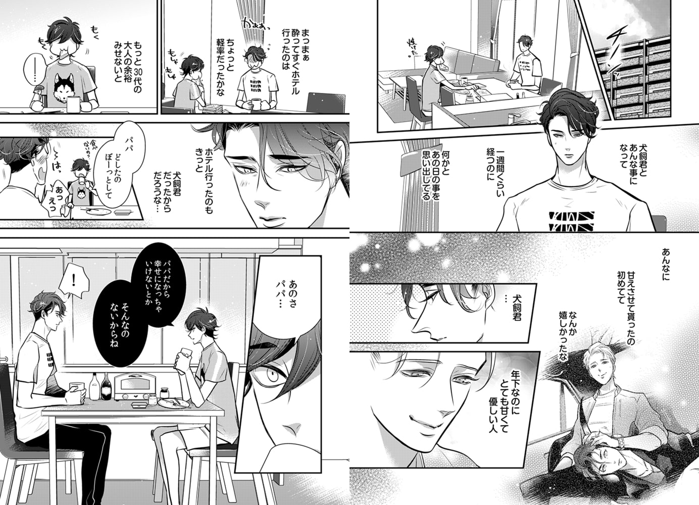 「綺麗ですね…蓮己さんの乳首、目の色素と一緒で薄いピンク色だ」「恥ずかしいよ…気にしてるんだから…っ」ってあれ?お酒のせいかな、今すっごいドキドキしてる……ーーデザイナーでシングルファザーの蓮己誠一(はすきせいいち)は、息子の勧めで一念発起して婚活中。しかし愛息子への溺愛っぷりが空回りし、マッチする相手に中々出会えない日々を過ごしていた。そんなある日、同じ婚活パーティーに出席していた若くてエリートの犬飼と意気投合し、あれよあれよという間に深い仲に…。息子のため必死に仕事とパパを頑張りながら、実は誰かに甘えてみたい…と思っていた中、魅惑的な言葉で誘われ、今までにない心地良さを感じるも、次第に互いに抱えた悩みが明るみに…腹黒ダークエリート攻×ピュアで大人なハスキー受!?な胸キュン必須な恋☆