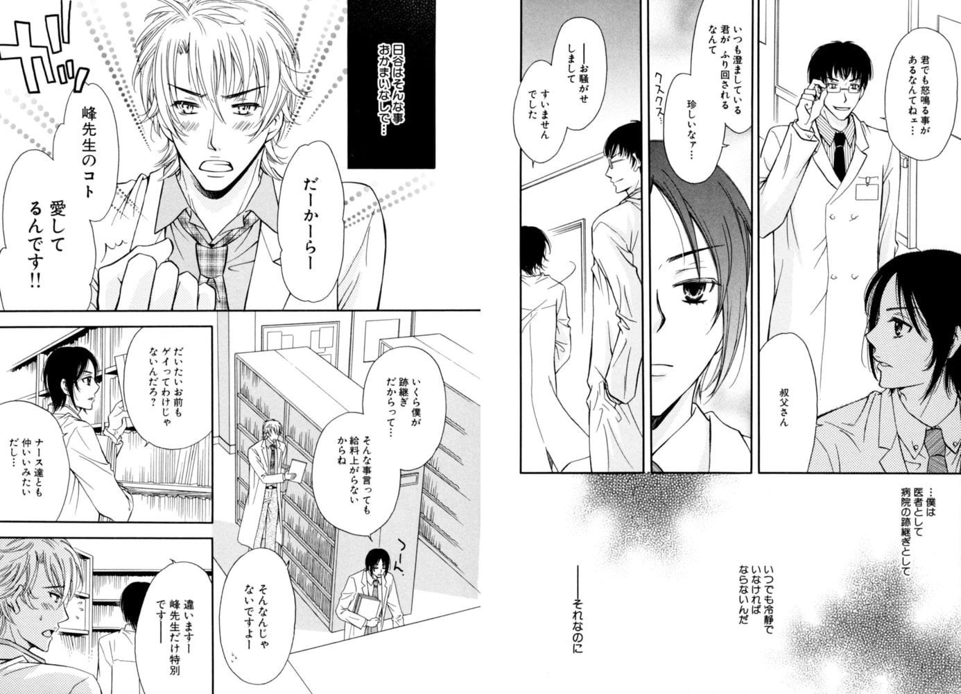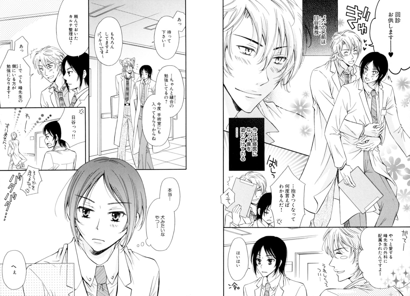 外科医の峰は、病院の裏庭で倒れていた青年、日谷を助けた。5年後、研修医になった日谷に「愛してる」と追いかけられるが、峰は愛の言葉など信じない。なのにまっすぐな瞳で求められ、そのまま……。こんなはずではなかった、と混乱する峰だが……!? ワンコ×ツンデレのホスピタルラブ!!