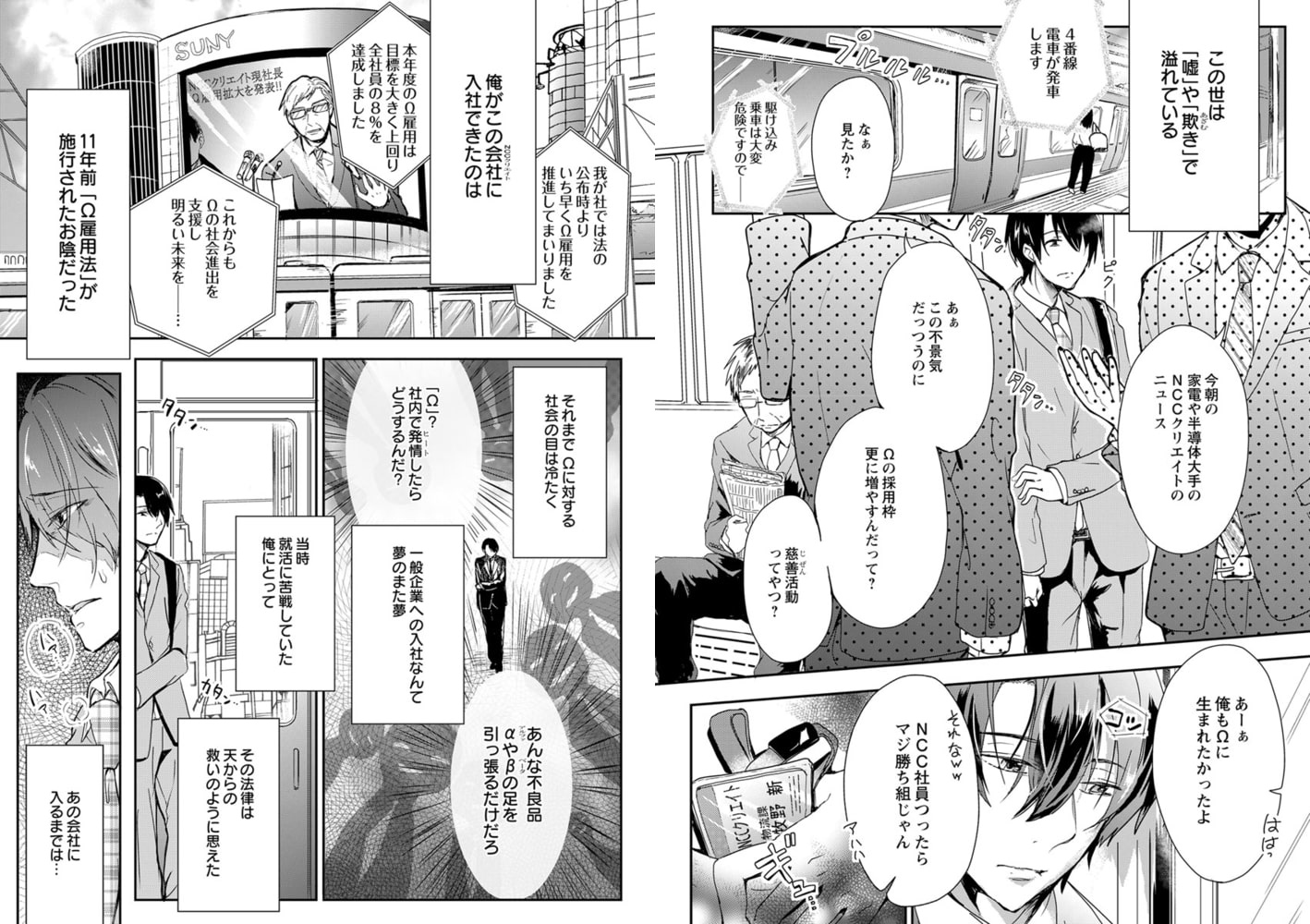 社会的にΩの地位がとても低い、現代日本によく似た世界。地位格差を是正するため施行された「Ω雇用法」により、企業はΩを積極的に雇用することを推奨されていた。Ωの主人公・牧野(まきの)もまた、Ω雇用法により大企業に採用されたΩのひとり。α(アルファ)やβ(ベータ)ですら簡単に就職することが難しい花形企業での採用だったが、そこで牧野に与えられた役割は、αやβたちの性処理を担当する「性社畜」としての業務だった……。