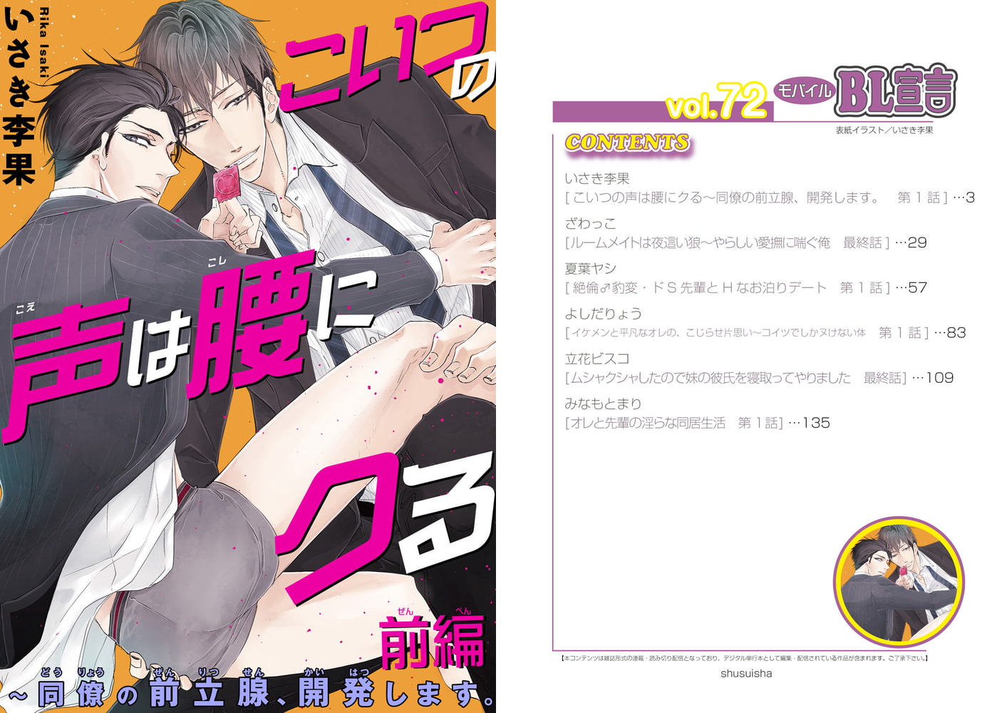 【モバイルBL宣言vol.72】表紙&巻頭カラーはいさき李果先生『こいつの声は腰にクる~同僚の前立腺、開発します。』酔った勢いでセフレに発展!?ノンケ×ノンケのリーマンラブ!ほか豪華連載は、ざわっこ先生『ルームメイトは夜○い狼~やらしい愛撫に喘ぐ俺』、夏葉ヤシ先生『絶倫♂豹変・ドS先輩とHなお泊りデート』、よしだりょう先生『イケメンと平凡なオレの、こじらせ片思い~コイツでしかヌけない体』、立花ビスコ先生『ムシャクシャしたので妹の彼氏を寝取ってやりました』、みなもとまり先生『オレと先輩の淫らな同居生活』