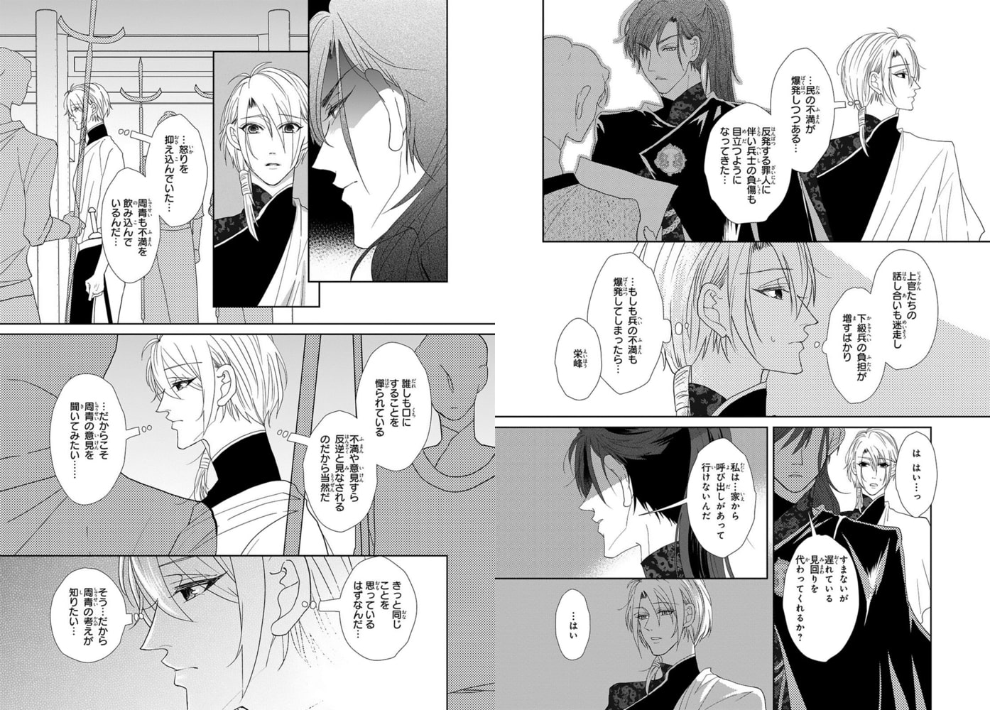 代々王に仕える一族の時期当主として、剣の腕もたつ若き将軍・李周青の隣には常に補佐官・高栄峰の姿がある。母の罪を背負い反逆者として軍の人間からも疎まれる栄峰だったが…周青からの信頼は厚く、また周りには秘密の恋人同士。この先も一緒のはずだった…王が新しく迎えた妃・明蘭が現れるまでは。全く笑わない妃が微笑むのは人が処刑されるとき。美しく微笑む彼女に魅了される王は、笑顔が見たいが為に小さな罪でも処刑し始めて…軍に敵意を持ち始める国民、疲弊する軍そして淡々と任務を遂行する周青の気持ちがわからなくなる栄峰…悩む栄峰の前に自分が「王の息子」だと知る人物が近づいてきて…若き将軍×反逆の子の中華ファンタジー