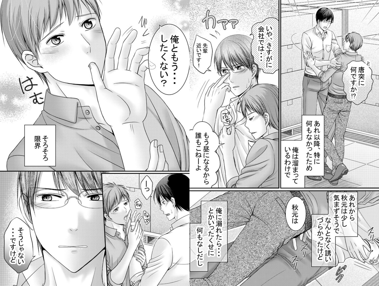 ゲイの市村は職場の長身イケメン後輩、秋元が好きだ。仕事中に眼鏡を壊したお詫びと称し、秋元の童貞を卒業させたがその後ぎくしゃくしていた。身体から始まった関係だから、仕方がないのだろうか。痺れを切らした市村は、仕事中に秋元をセックスに誘う。ためらいつつ了承してくれた秋元と、会社の倉庫で声を我慢してシコシコ抜き合い。敏感なトコロを触れられ攻められ快感に浸る2人。その後、業務に戻るも秋元の態度がどうもおかしい。気さくで誰とでも打ち解けられる市村は社内でも評判が良い。いつものように男性社員と談笑していると秋元が異様に絡んでくる。これはひょっとして嫉妬をしているのだろうか。同僚の名前を出しただけでも不機嫌になる秋元。この前まで童貞だった彼は、おそらくは恋愛経験が少ないのだ。よし!先輩として手取り足取り腰取りみっちり教えてやらないとな。ゲイ先輩とイケメン真面目後輩のヒミツの社内恋愛。オリジナルボーイズラブコミック
