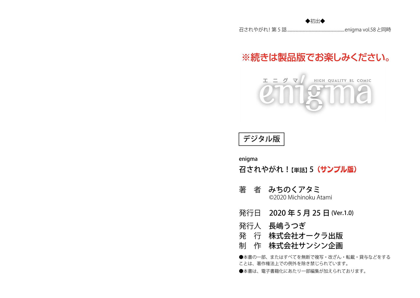 【本作はWEB雑誌「enigma」に収録されています。重複購入にご注意ください。】