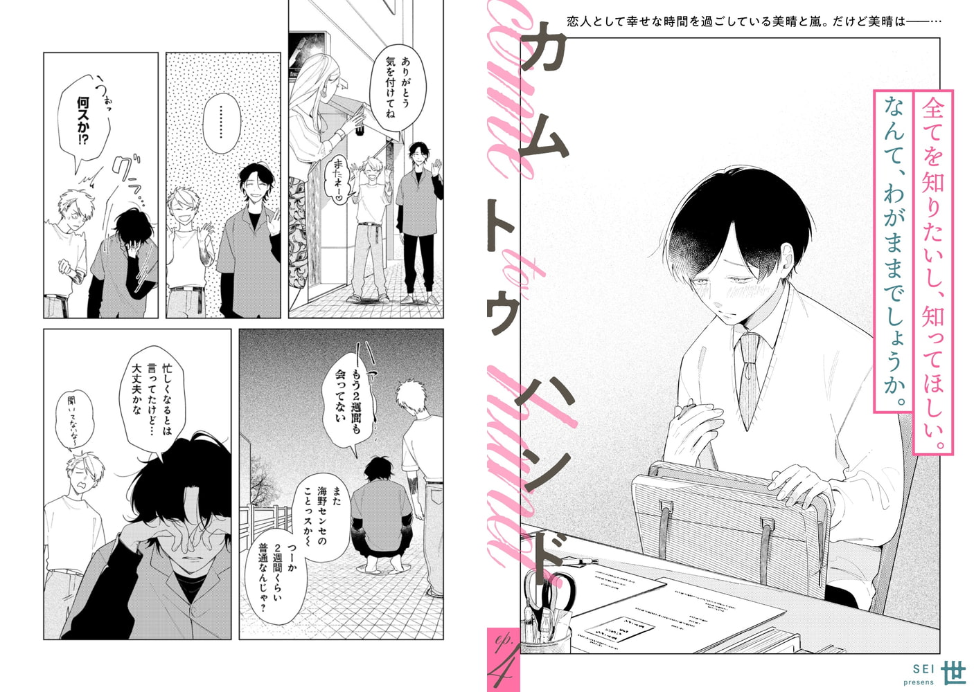 お互いありのままの姿を見せあい、順風満帆な恋人関係を続けているはずの嵐と美晴。少しずつ素直になりながら築く関係の中、嵐の海外出張中に会った元カレの一言で、美晴は考えないようにしてきた「ある事」を意識してしまう。 ※本電子書籍は『mimosa vol.9』収録の「カム トゥ ハンド 第四話」と同じ内容です。